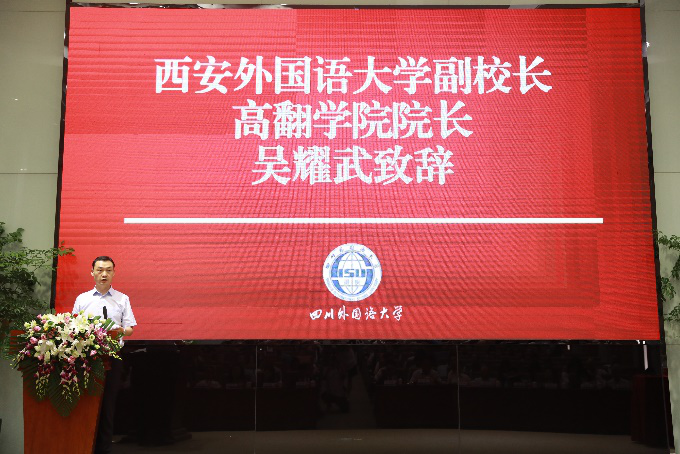 西安外国语大学副校长、高翻学院院长吴耀武代表市外高校,向翻译学院成立十周年表示祝贺。他指出:世界正处于百年未有之大变局,机遇与挑战并存,荣誉与艰难共生,我们应认清危机,把握时机,抢抓先机,共同促进翻译事业取得长足发展。