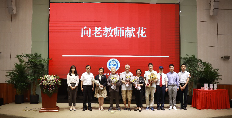 随后,来自翻译学院毕业生吴晓、在校生代表陈语斐、教师代表陈宇翔分别发言,送共同祝愿学院的事业蒸蒸日上。祝朝伟副校长带领学院师生为退休老教师献花。
