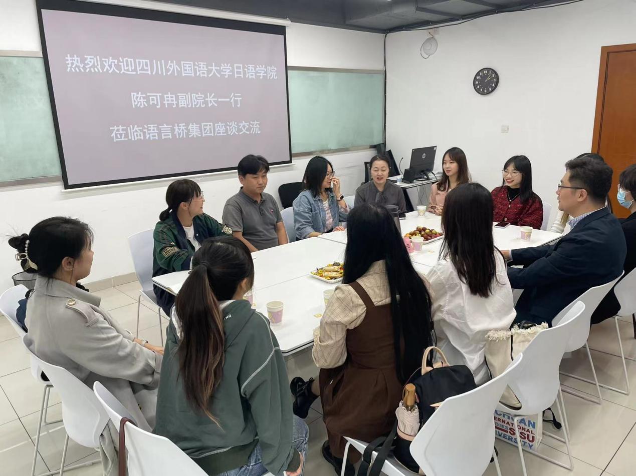 参观活动结束后,日语学院师生与语言桥集团校企合作部负责人、项目经理等座谈交流。除李璐总监外,语言桥方面与会人员有:集团校企合作事业部教研经理余嘉琪、翻译中心Metagame部长李日男、口译项目部经理罗丹。