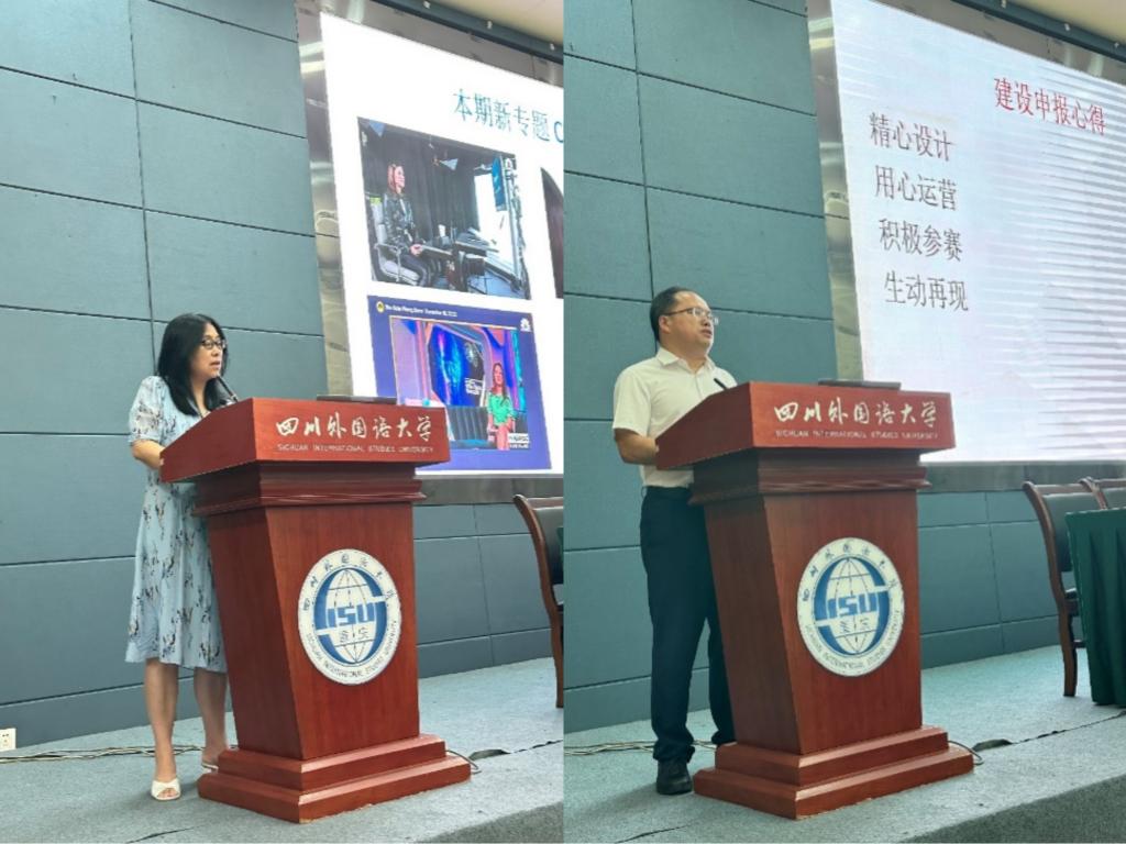 第四位汇报人是国家级一流课程《时政视听说(1)》的主持人魏涛,汇报的主要内容包括该国家级一流课程的建设历程、成功申报的经验以及未来建设规划。通过图文并茂的演示,魏涛直观地向与会人员展示了该课程听力通关和时政专题两大主要模块的教学设计样例和主要特色。课程以高强度、宽题材的线上线下英语视听说训练,帮助学生提高英语听说能力,拓展各类时政专题知识,培养学生自主学习、独立分析和解决问题的能力以及思辨能力,并且有机融入思政元素,引导学生树立正确的价值观,激发学生的爱国情怀,增强学生的“四个自信”。