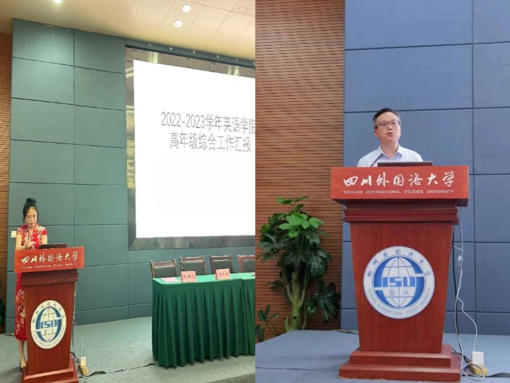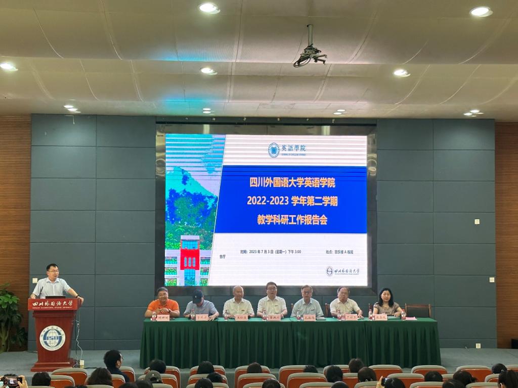 2023年7月3日下午3:00-6:30,英语学院在歌乐楼A栋学术报告厅顺利举行2022-2023年度教学科研工作报告会。四川外国语大学校长董洪川、副校长祝朝伟、副校长王仁强、副校长严功军、教务处处长刘玉梅、研究生院院长(学科办主任)胡安江、科研处处长王伟以及英语学院全体教职员工参加了本次报告会。会议由英语学院院长赵永峰主持。