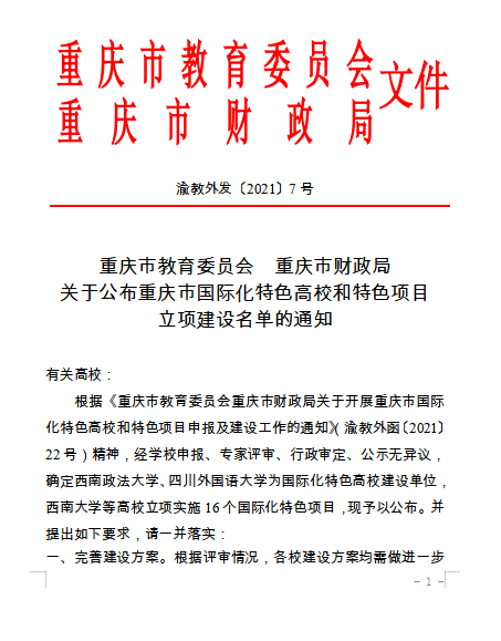近日,重庆市教育委员会、重庆市财政局联合下发《关于公布重庆市国际化特色高校和特色项目立项建设名单的通知》。我校成功获批国际化特色高校建设单位。据悉,本次立项建设的特色高校一共2所,特色项目一共16个。