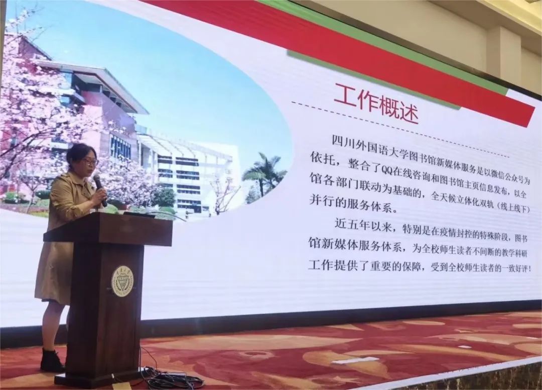 本次大会上,图书馆新媒体建设项目负责人、副研究馆员张晓梅以《新媒体赋能智慧图书馆发展的川外路径》为题进行了案例分享及经验交流,获得与会专家、同行的一致认可。