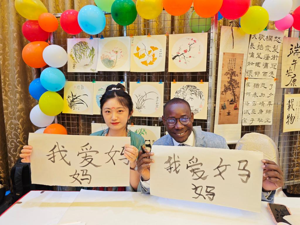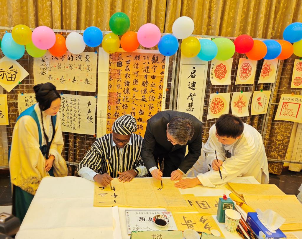 在书画展台,嘉宾们跃跃欲试,纷纷拿起文房四宝,在孔院老师的指导下,写汉字,绘竹兰。不同书法字体之间线条的迥异,中国画几笔水墨营造的深远意境,都使得大家感受到中国传统文化的无穷魅力。