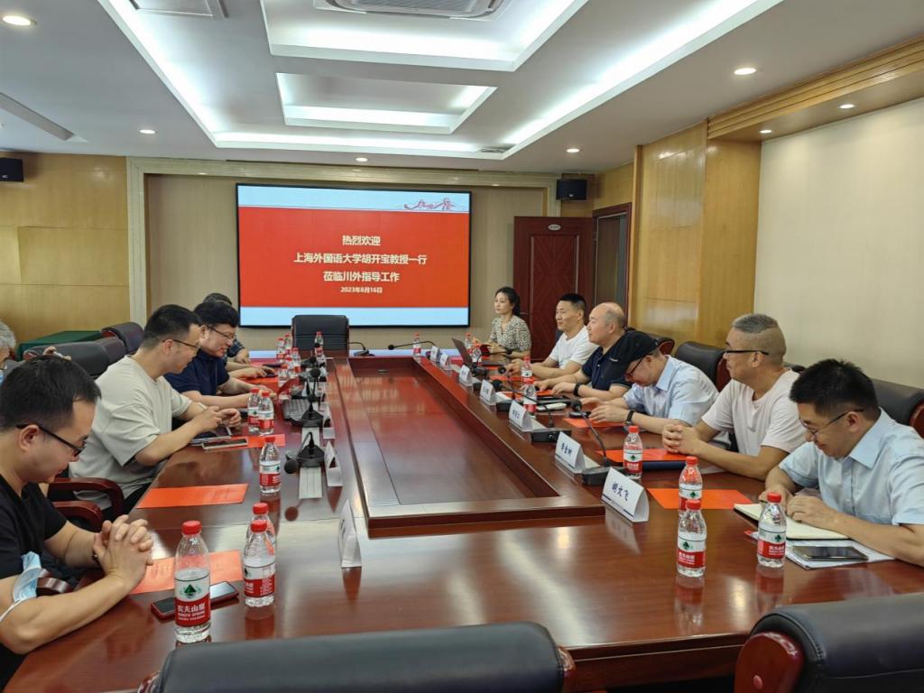 2023年8月16日,上海外国语大学校长助理胡开宝教授一行在立德楼A301会议室与我校师生进行了座谈,研究生院、科研处、教务处、翻译学院、商务英语学院、语言智能学院、俄语学院、外国语文研究中心、词典学研究所等部门的领导和老师参加了座谈。王仁强副校长代表学校对胡开宝教授一行的到来表示欢迎,并对我校语料库语言学的建设情况进行了介绍。
