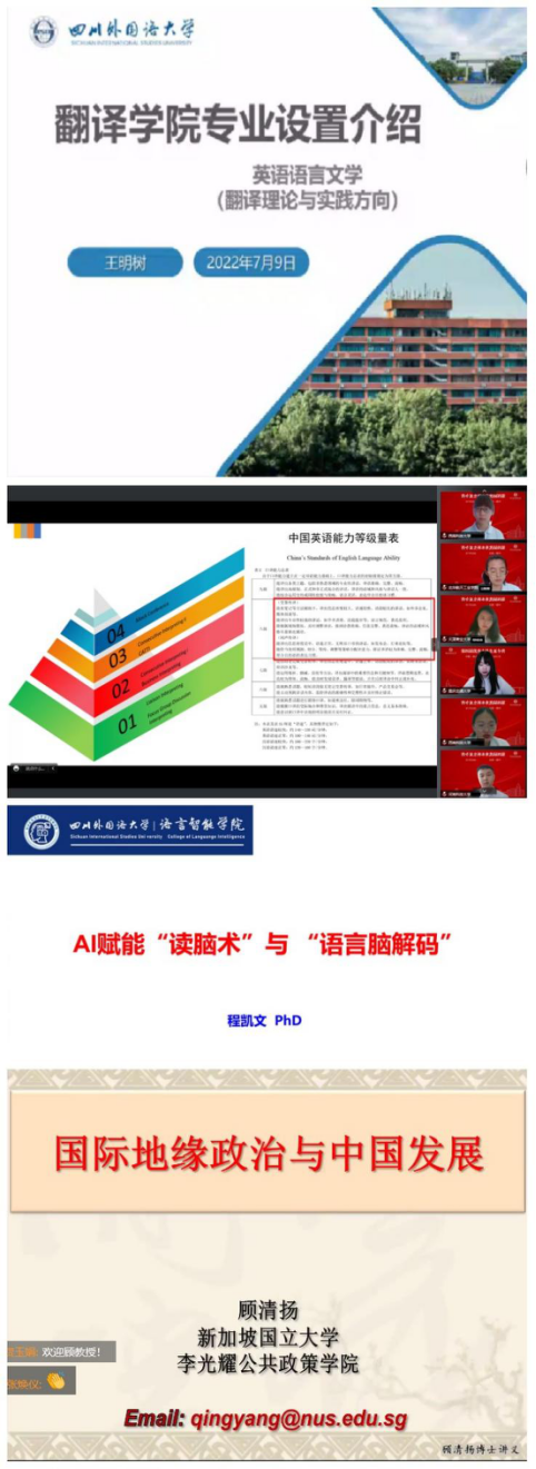 2022年7月9日至10日,四川外国语大学第四届优秀本科生夏令营成功举办。受疫情影响,本次夏令营采取网络远程方式进行。由研究生院牵头,英语学院、马克思主义学院、国际教育学院、中国语言文化学院、新闻传播学院、法语学院、德语学院、日语学院、东方语言文化学院、国际关系学院、国际金融与贸易学院、翻译学院、商务英语学院、国际法学与社会学院和语言智能学院等15个学院共同参与举办此次活动。