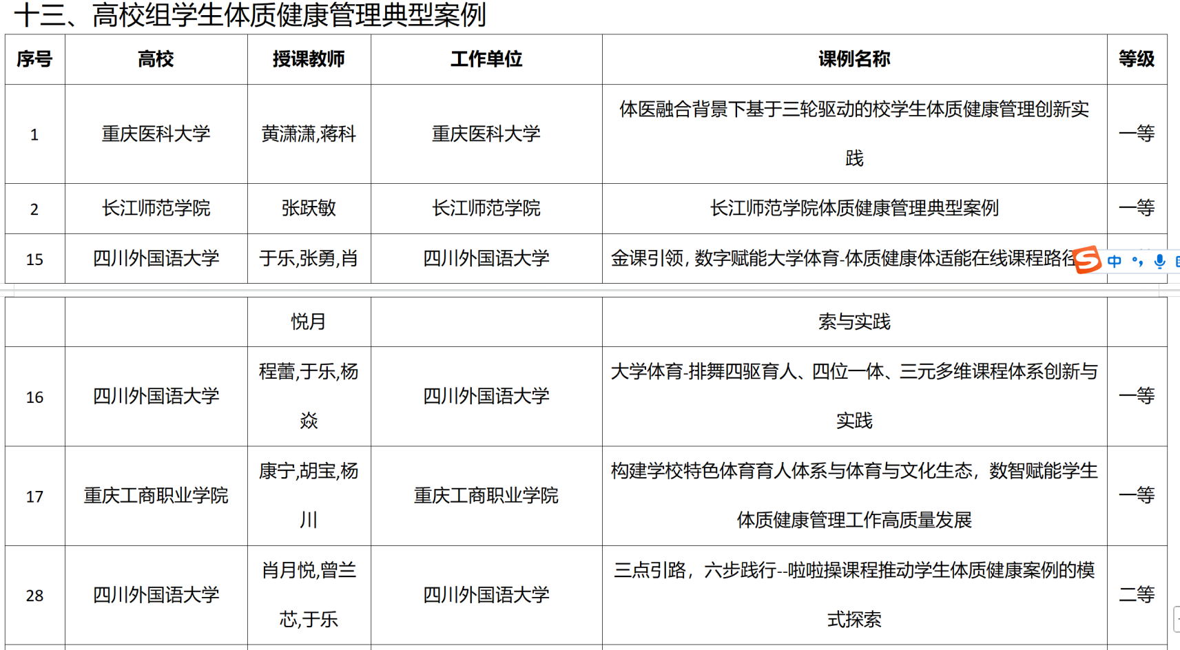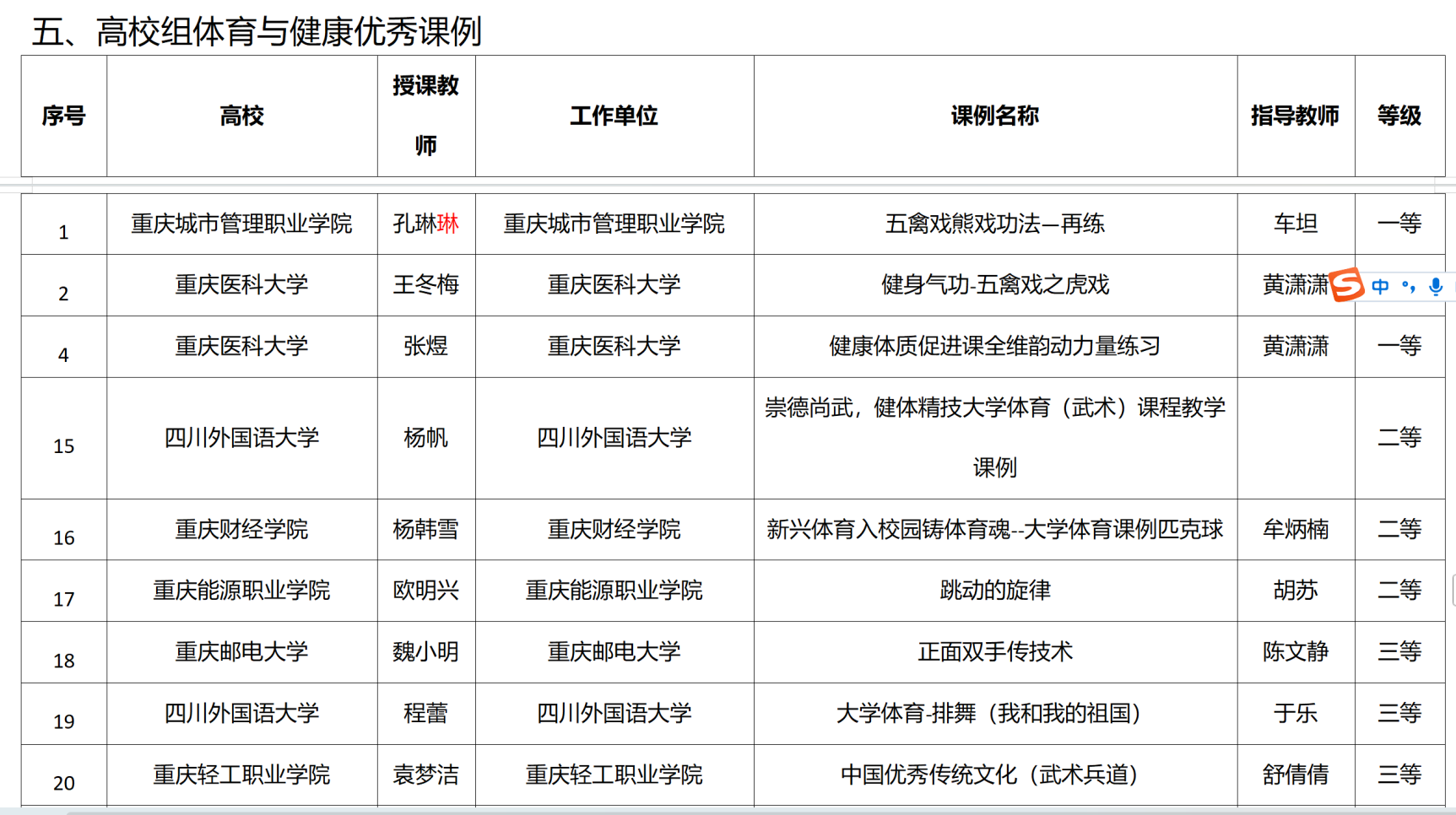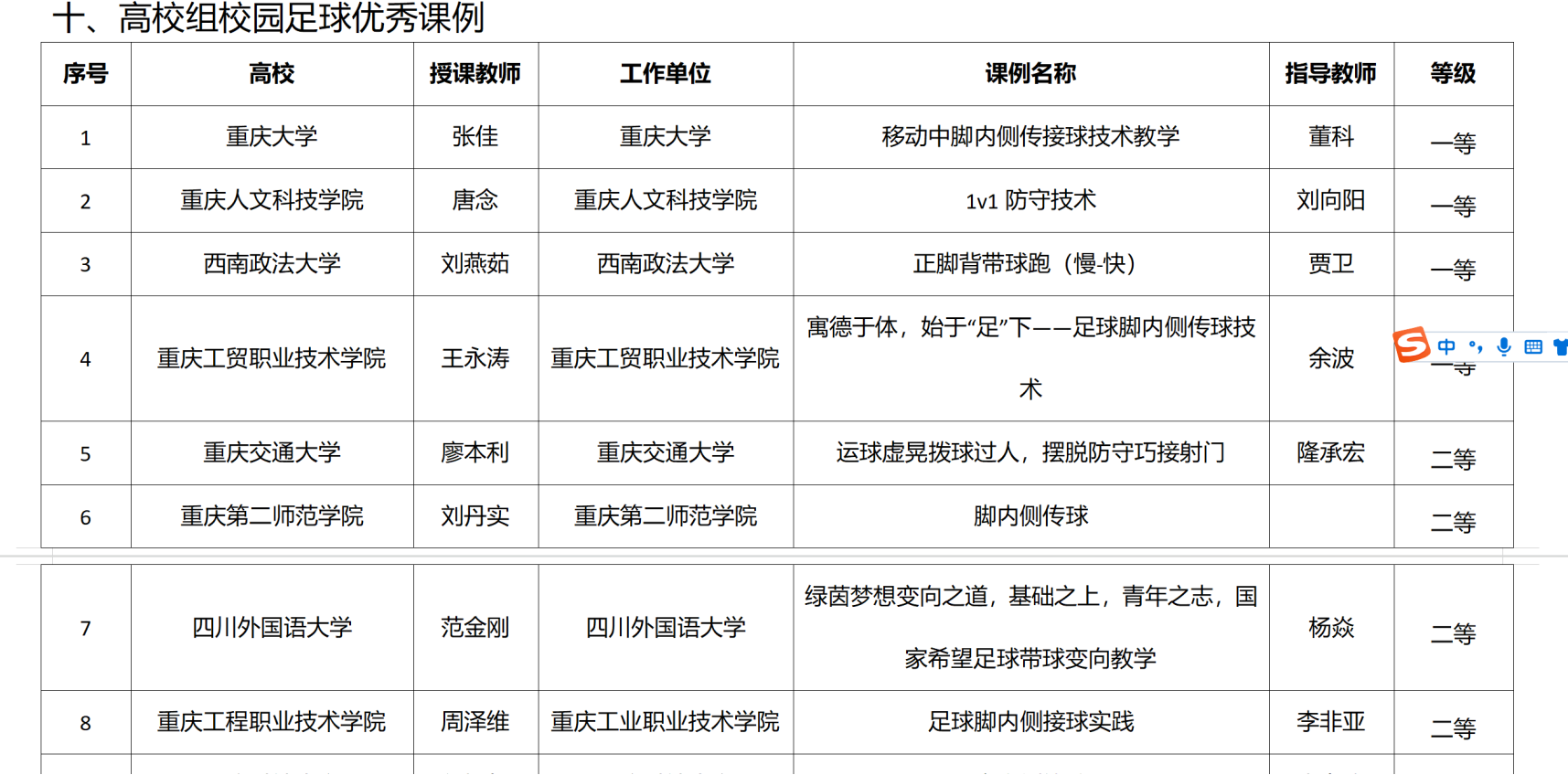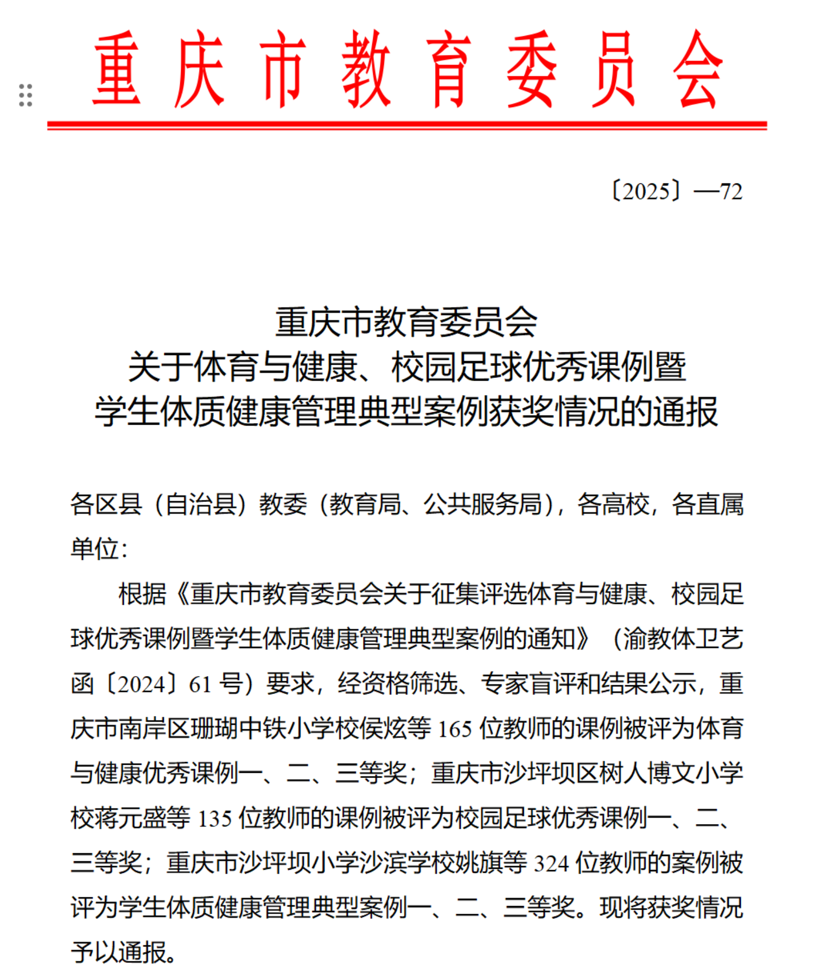 近日,重庆市教育委员会发布了《关于体育与健康、校园足球优秀课例暨学生体质健康管理典型案例获奖情况的通报》(渝教高函〔2025〕72号),我校教师于乐、程蕾、杨帆、肖月悦、范金刚等5人获6项优秀课例及典型案例奖项,其中高校组体育与健康优秀课例二等奖1项、三等奖1项;高校组校园足球优秀课例二等奖1项;高校组学生体质健康管理典型案例一等奖2项、二等奖1项。