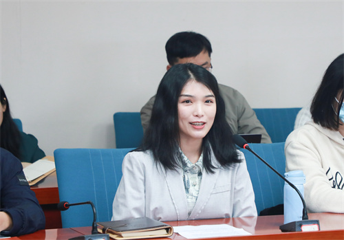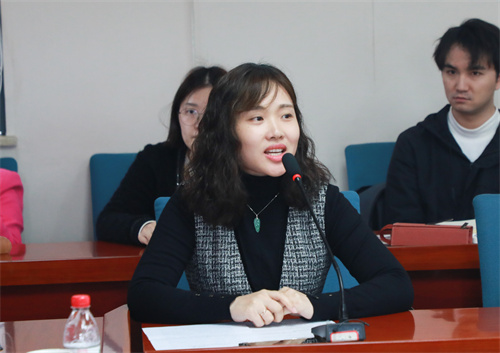 新进教师代表贾萌萌从新教师的角度出发,分享了自己对于成为一名合格教师的看法。贾老师提到,作为一名教师,既要关注专业知识和教学方法的更新,也要注重提升自身科研能力;既要帮助学生在课堂上提高专业知识,也不能忽视学生在课堂外的素质提升。