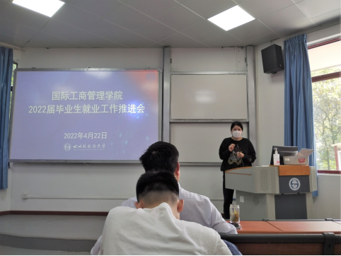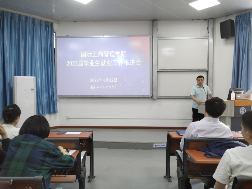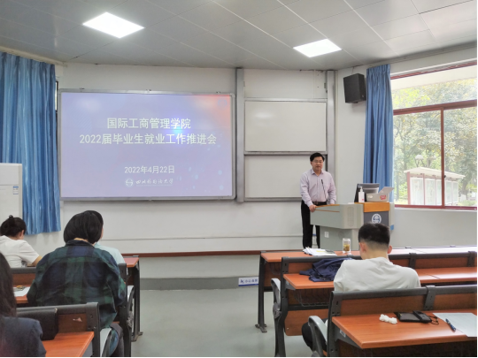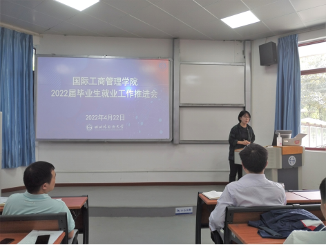 2022年4月22日,国际工商管理学院于培英楼水榭一教室召开了2022届毕业生就业工作推进会,学院领导班子、各专业系主任、专任教师、行政教辅人员等全体教职员工参加。会议贯彻落实党中央、国务院、各级政府部署和学校工作要求,压实责任,勠力同心,攻坚克难,对做好国际工商管理学院2022届毕业生就业工作再动员、再部署,确保完成毕业生就业目标任务。党总支副书记王婷主持会议。