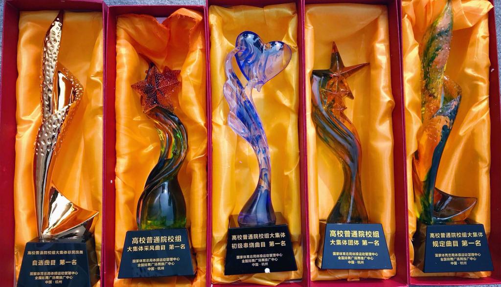 我校派出崔梦瑶等18名同学参加了单人、采风、规定、自选、串烧5个项目的比赛。在首先进行的单人比赛中,新闻传播学院陈林和国际商学院刘佳宝两位同学凭借稳定出色的发挥分别获得高校普通院校组高级单人第一名和第四名的好成绩。随后进行的采风曲目、规定曲目及自选曲目三项集体比赛中,我校健儿以流畅而有创意的编排、稳定的发挥、富有激情的表演征服了裁判和观众,赢得对手的认可,获得各项目的全场最高分。在最后进行的集体串烧曲目比赛中,同学们更以9.20的全赛最高分再夺单项第一名,毫无悬念地将高校普通院校组大集体团体冠军收入囊中。