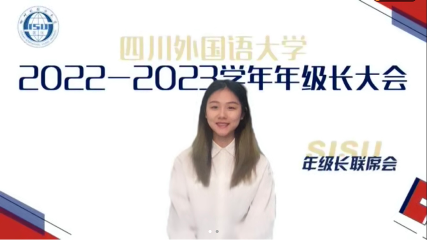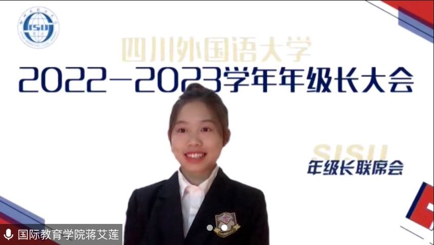 2022年12月9日,2022-2023学年年级长大会在线上召开。出席本会议的有四川外国语大学党委学生工作部部长崔光军、思政科科长朱磊、2021-2022学年优秀年级长以及2022-2023学年全体年级长。会议由年级长联席会周恩慈主持。