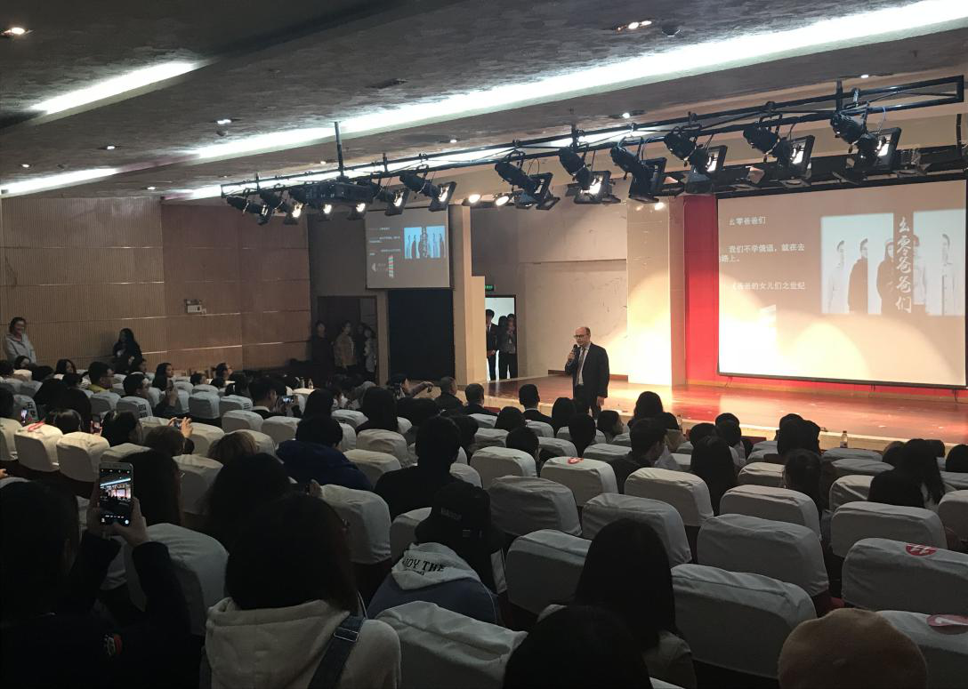 李克勇校长对来宾表示热烈欢迎并陪同来宾一起参观俄语系实践周配音大赛。鲁德大使在大赛现场发言并与学生们积极互动。