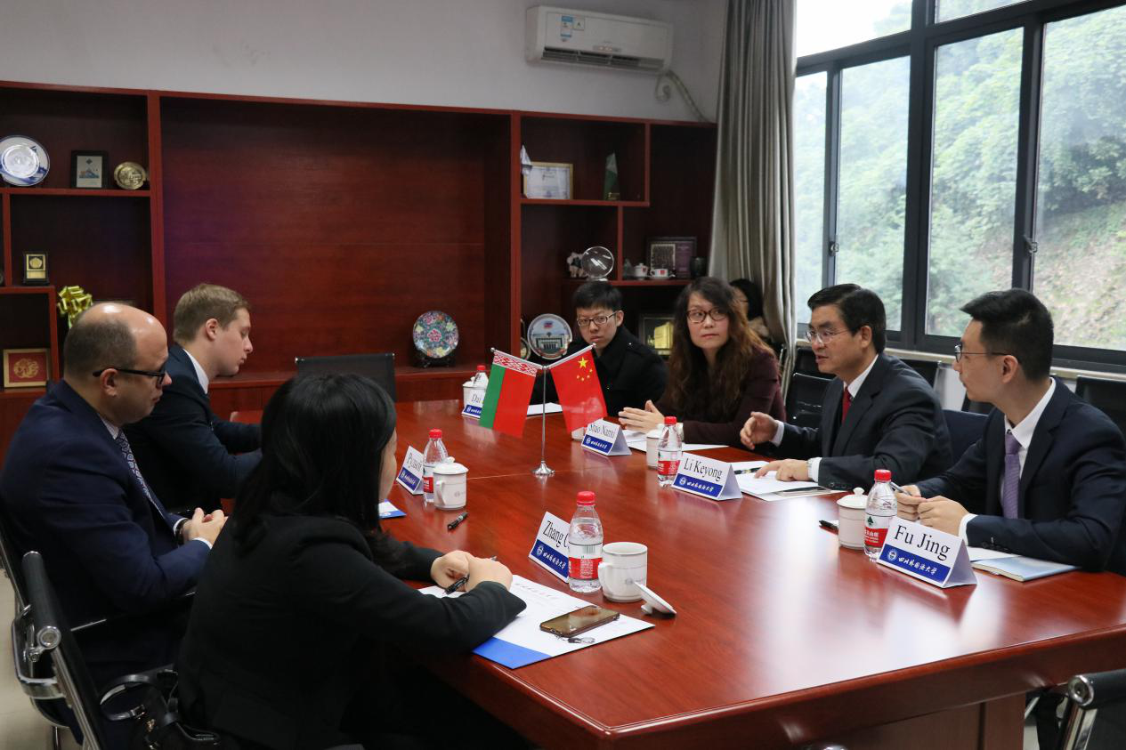 11月9日上午,白罗斯特命全权驻华大使Рудый Кирилл Валентинович(鲁德·基里尔·瓦连京诺维奇)、白罗斯驻华大使馆三秘ЕмельяновДмитрий Алексеевич(叶梅利亚诺夫·德米特里·亚列克谢维奇)来访我校,重庆市外办欧非处干部张璨陪同来访。校长李克勇亲切接待了来宾,俄语系副主任邵楠希、外事秘书付景,国际合作与交流处项目主管代柯共同参与接待。