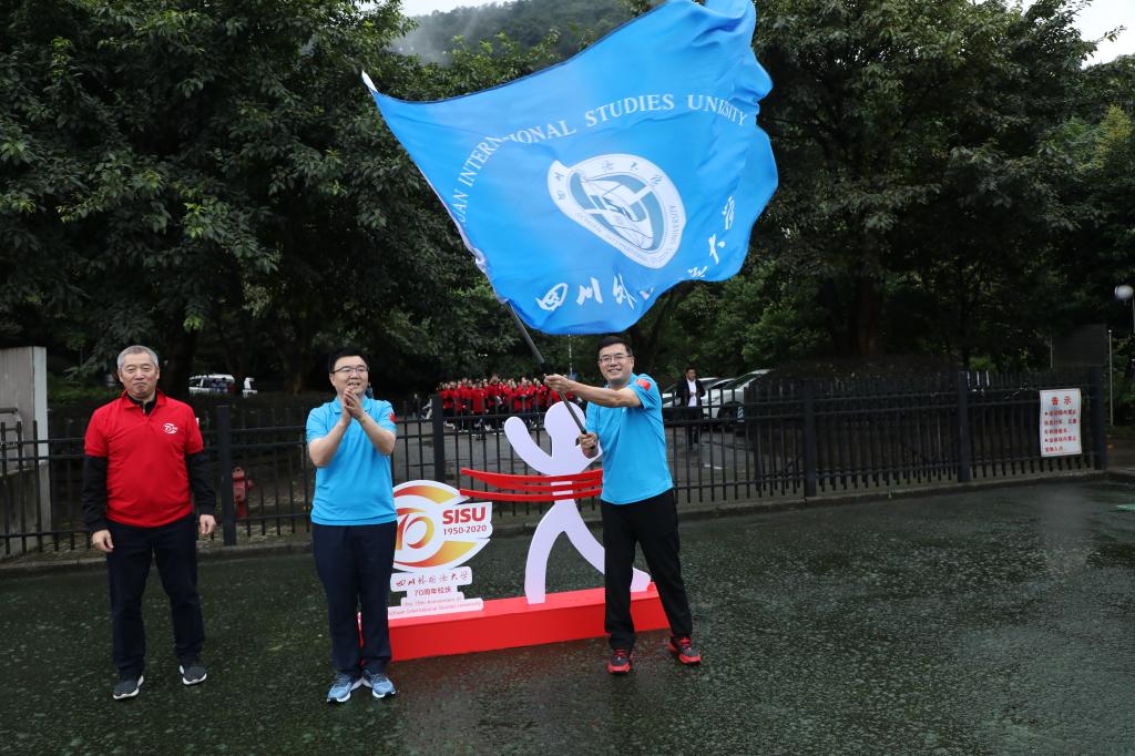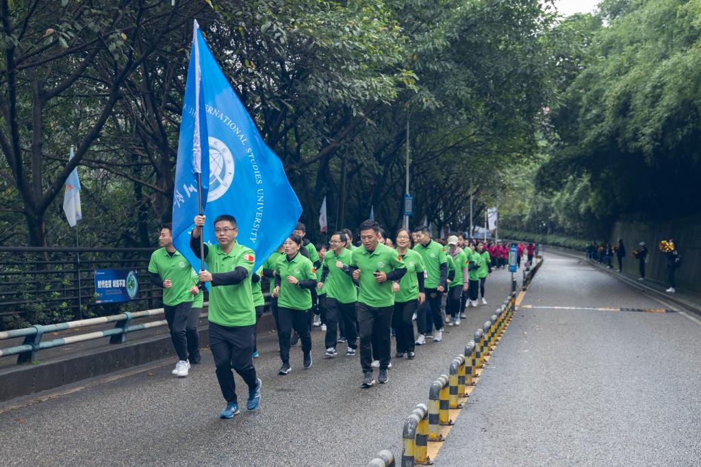 川外70年发展历史,历经7个不同的历史时期。本次活动设置身着不同颜色T恤的7个方队和7段路程,每个方队由1名旗手举校旗领跑,从东区1号门至西区运动场,一路向上,展示了川外人昂扬奋进的斗志。