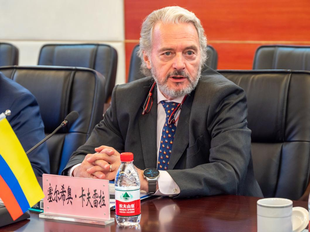 塞尔希奥·卡夫雷拉对学校的热情接待表示感谢,他指出此次访问川外旨在加强既有合作,探讨新的合作模式。他表达了希望通过各类型奖学金项目推动中哥学生的双向交流,与川外开展科研活动助力哥伦比亚高校教师赴华进行学术交流以及在哥伦比亚设立新的孔子学院等合作意向。