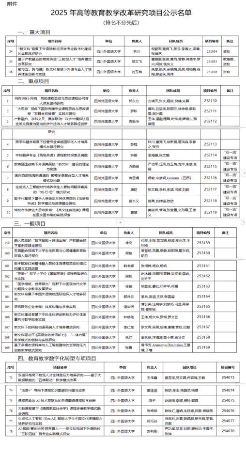 近日,重庆市教育委员会公布了2025年高等教育本科教学改革研究项目立项名单,我校获批立项30项,其中重大项目3项,重点项目4项,“双一流”专项重点项目6项,一般项目11项,数字化专项项目6项,立项数量再创新高。