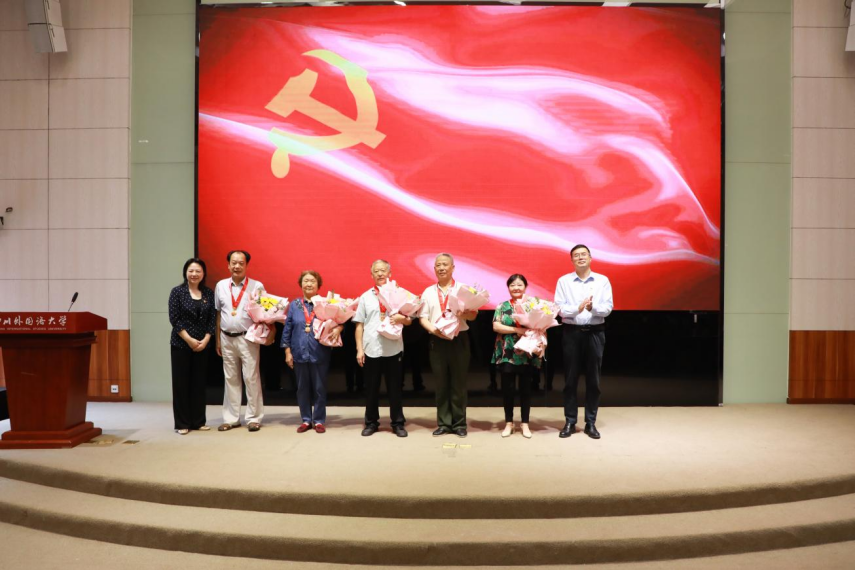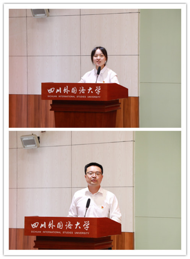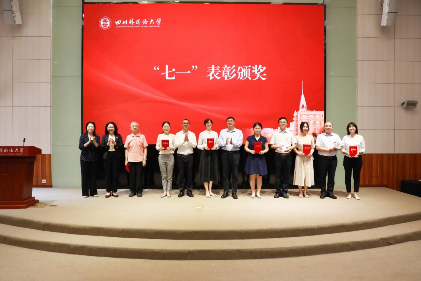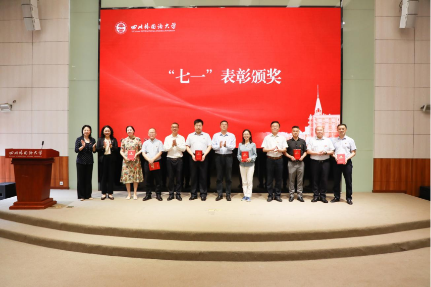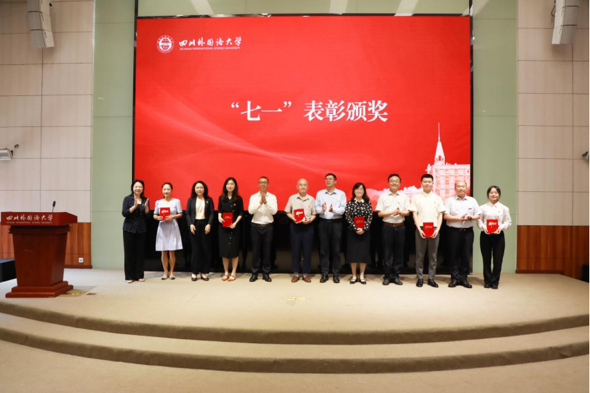 党委常委、副校长卢波同志宣读《中共四川外国语大学委员会关于表彰全校优秀共产党员、优秀党务工作者和先进基层党组织的决定》《中共四川外国语大学委员会关于表彰2021年党组织书记抓基层党建工作考核等次优秀人员的决定》《关于颁发“光荣在党50年”纪念章的决定》。