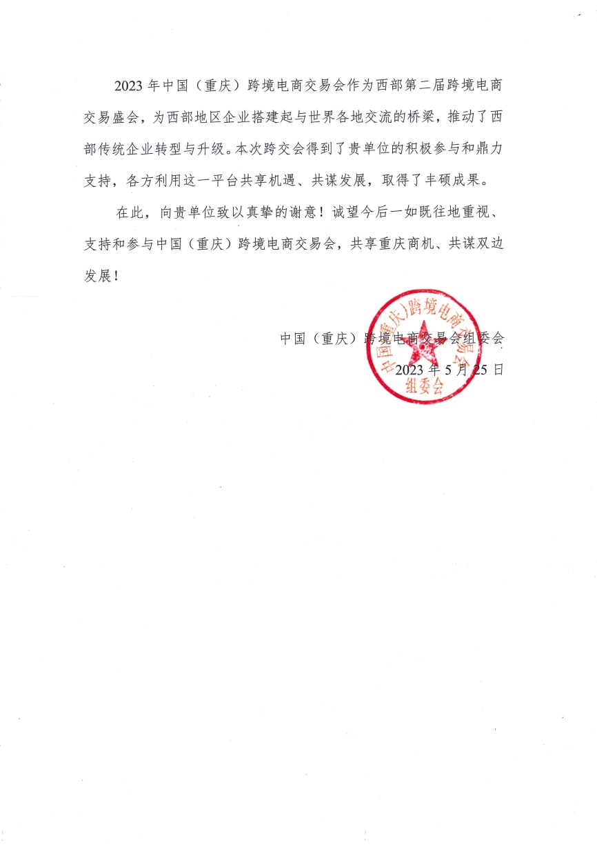 近日,我校收到来自中国(重庆)跨境电商交易会组委会的感谢信,感谢我校相关单位对2023年中国(重庆)跨境电商交易会的积极参与和大力支持。