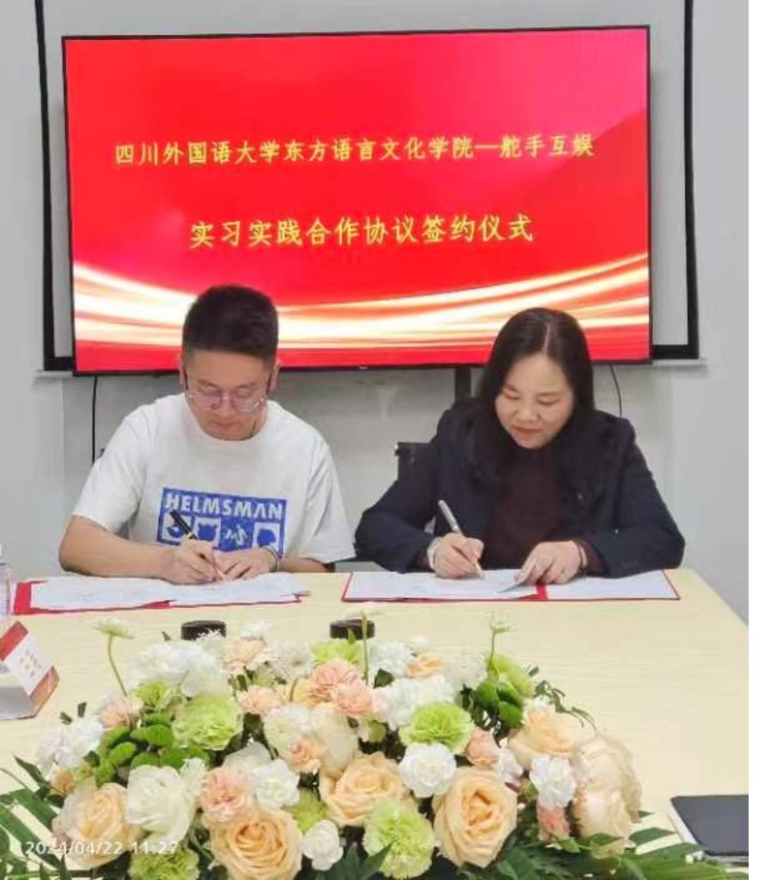 2024年4月22日,东方语言文化学院与舵手互娱共建学生实习实践基地签约授牌仪式在成都举行。东方语言文化学院院长罗文青、舵手互娱公共事务与人力资源负责人梁立林代表双方签约授牌,学院办公室、团总支和辅导员代表、舵手互娱合伙人等出席仪式。