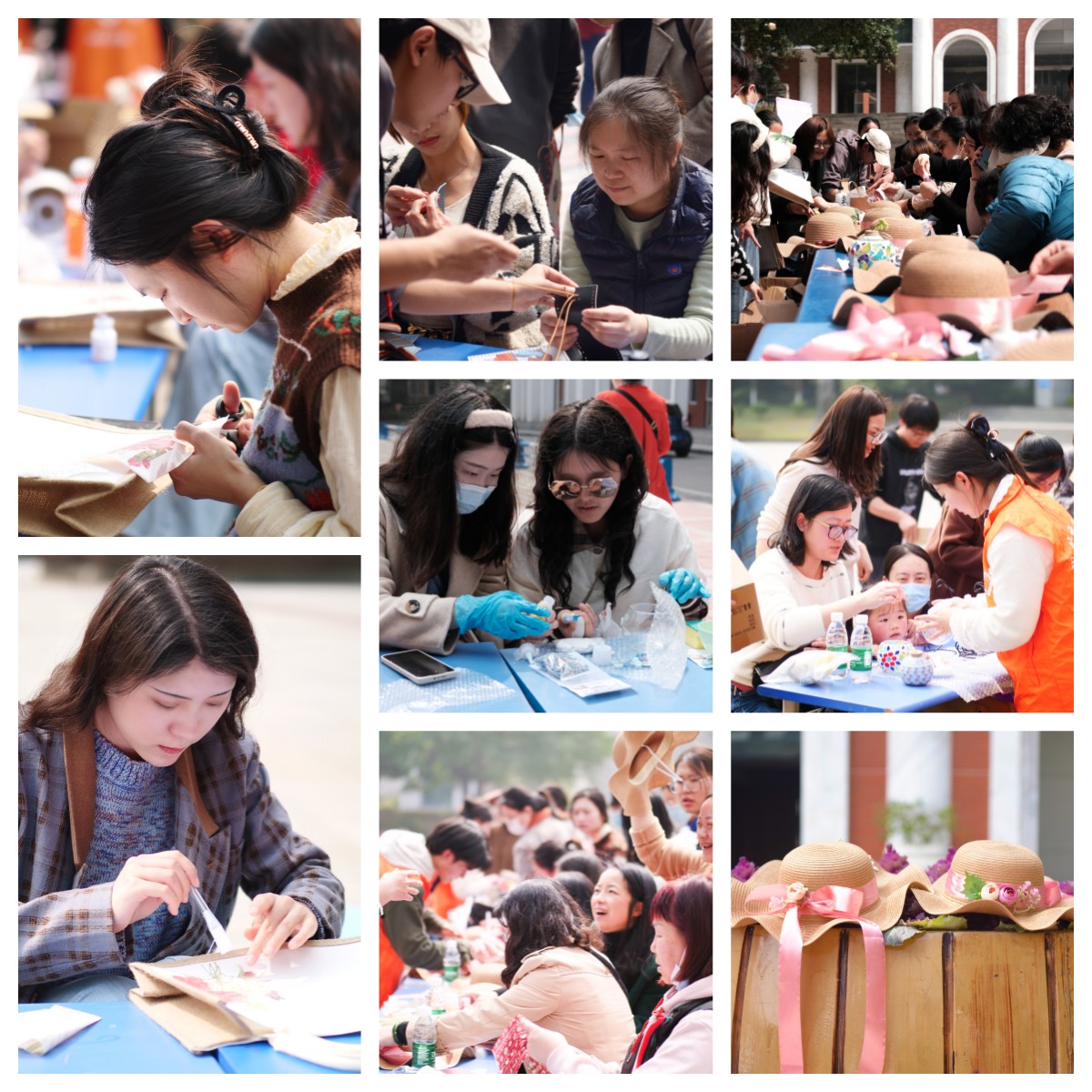 花香渐浓春风暖,独属女性的节日,如期而至。为庆祝第113个“三八”国际劳动妇女节,3月8日学校工会分别在学校东区月亮广场、西区字母广场举办了“美丽时光·为你而来”手工DIY活动,现场多种手工材料可供教职工们选择,烛台灯、积木花、相框、草帽、花瓶......让教职工一起动手制作心中的美。 活动过程中,不少老师一边动手制作一边拍照记录自己动手的时刻、拍下成品发到朋友圈,还有的老师在自己做完成品后,还指导旁边才入门的同事。整个活动现场弥漫着快乐和幸福的味道。