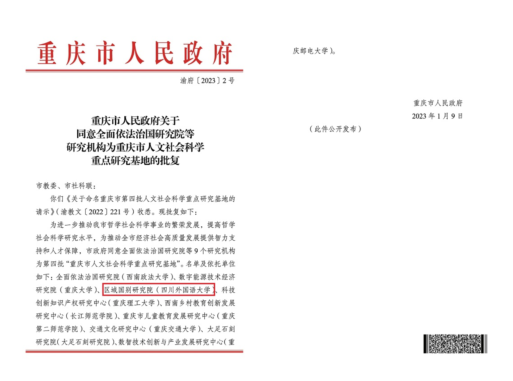 2023年1月9日,重庆市人民政府下发 “关于同意全面依法治国研究院等研究机构为重庆市人文社会科学重点研究基地的批复”(渝府〔2023〕2号)文件,正式批准四川外国语大学区域国别研究院等9个研究机构为第四批“重庆市人文社会科学重点研究基地"。