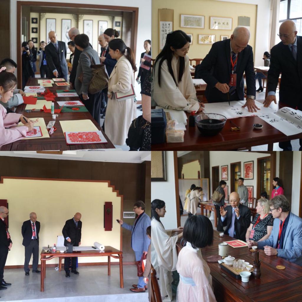 会后,李小川副校长陪同外宾参观校园,在刻有多国语言、象征着沟通世界的万国文墙前合影留念;听同声传译讲解校史,了解川外70载历程;体验中国传统文化,观剪纸,写书法,听民乐,享茶道。李小川副校长现场作画,赠与外宾。