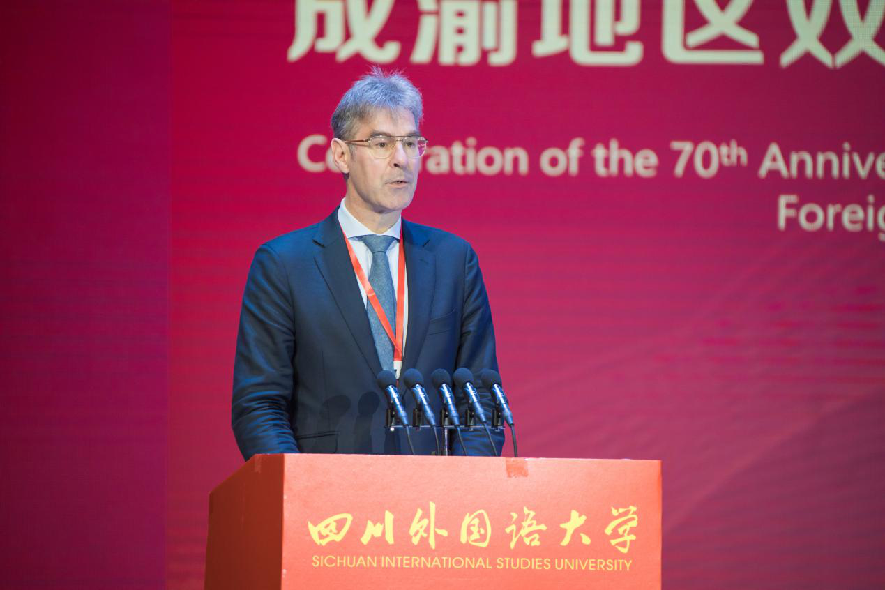 24日上午,庆祝建校70周年暨成渝地区双城经济圈高校外语联盟成立大会在东区大礼堂举行。大会采取同声传译的方式进行全球直播。12所外国驻渝蓉总领事馆与会嘉宾、外籍友好人士、在校外籍师生出席。荷兰王国驻重庆总领事孔思哲(Koen Sizoo)作为领团团长致辞,他表示,巴别塔的故事告诉我们,人类语言被有意扰乱,让人们之间存在鸿沟、误解和混乱,因此学习和教授语言极为重要。川外教授多国语言,扮演着融通中外,促进交流的角色,祝愿川外在第一个70年的基础上,更上一层楼。
