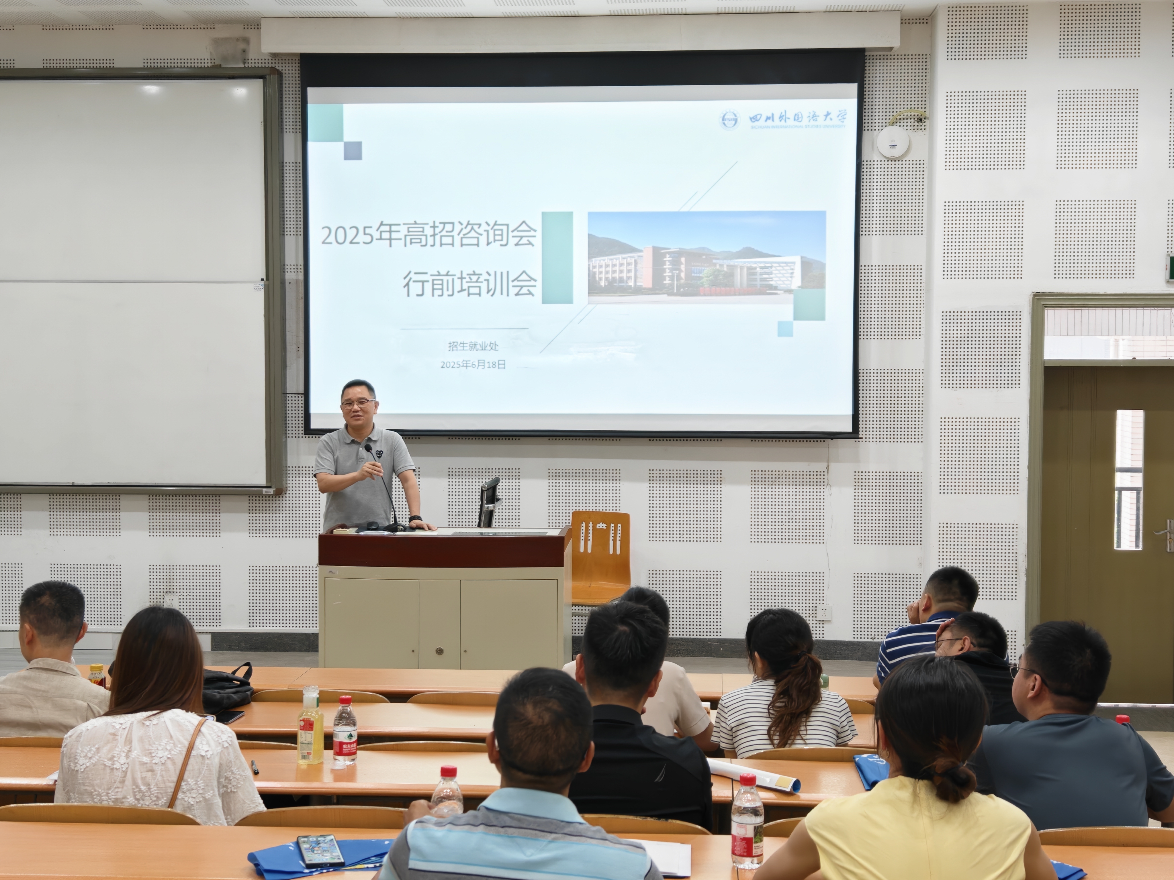 会上,申安桂介绍2025年招生宣传工作总体实施方案,着重强调今年招生咨询工作的重要性,要求各参会人员结合学校历年录取数据及考生个性化需求,提供针对性指导。他指出,招生宣传工作人员要充分认识当前招生工作所面临的新政策、新形势,稳扎稳打,充分了解学校的学科专业实力,尤其是外国语语言文学学科在最新一轮学科评估中进入前5%的情况;充分了解学校近几年就业逆势上扬、出海高质量就业成为我校就业特色的情况;全面介绍好学校的办学亮点和优势特色。同时,要细化招生宣传策略,积极为各地考生提供专业报考建议,吸引更多优秀学子报考我校。随后,兰雪芳老师围绕工作流程、招生政策、志愿填报、注意事项和热点问题等五个方面,对2025年招生咨询会工作进行详细讲解。