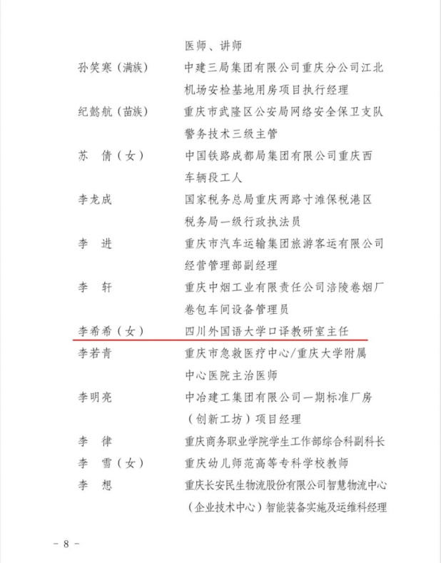 四川外国语大学翻译学院口译教研室主任李希希荣获2021—2022年度重庆市青年岗位能手。