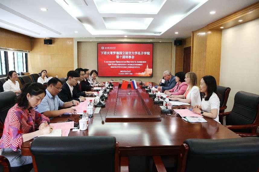 6月6日下午,俄罗斯下诺夫哥罗德国立语言大学(下语大)校长尼康诺娃(Nikonova Zhanna)、国际处处长安尼先科(Anishchenko Anatoly)、下语大孔子学院外方院长普罗沃托罗娃安娜(Provotorova Anna)一行来访我校并出席下语大孔子学院第十届理事会。我校校长董洪川、副校长祝朝伟、国际合作与交流处处长张幼斌、计划财务处处长于全辉、国际合作与交流处副处长朱红、下语大孔子学院中方院长敬菁华出席本次会议。会议由张幼斌主持,俄语学院教师付景担任翻译。