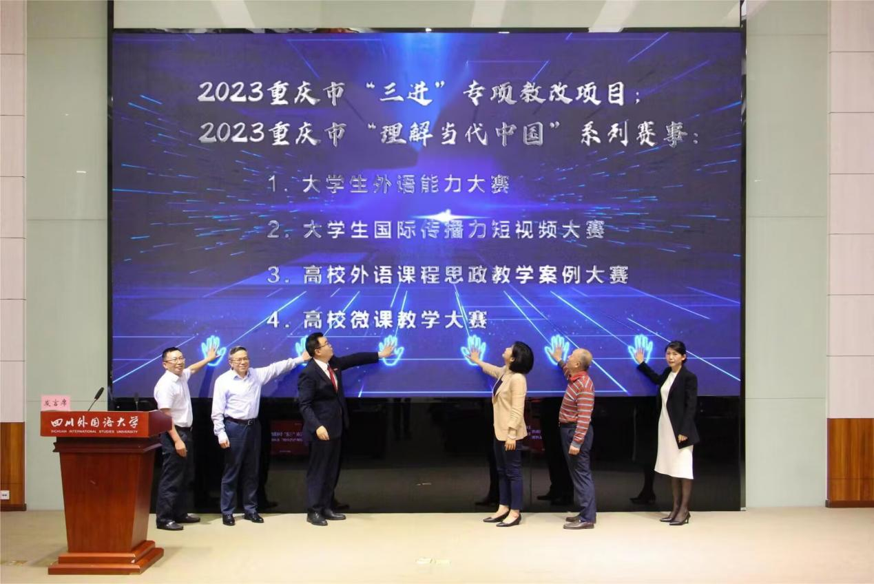 2023“外研社·国才杯”“理解当代中国”重庆市大学生外语能力大赛、2023“外研社·国才杯”国际传播力短视频大赛(重庆赛区)、2023年全国高校外语课程思政教学案例大赛(重庆赛区)、重庆市2023年本科高校微课教学比赛发布仪式于会议期间举行。蒋云芳、余志祥、董洪川、文旭、吴显友、王海燕共同启动赛事。