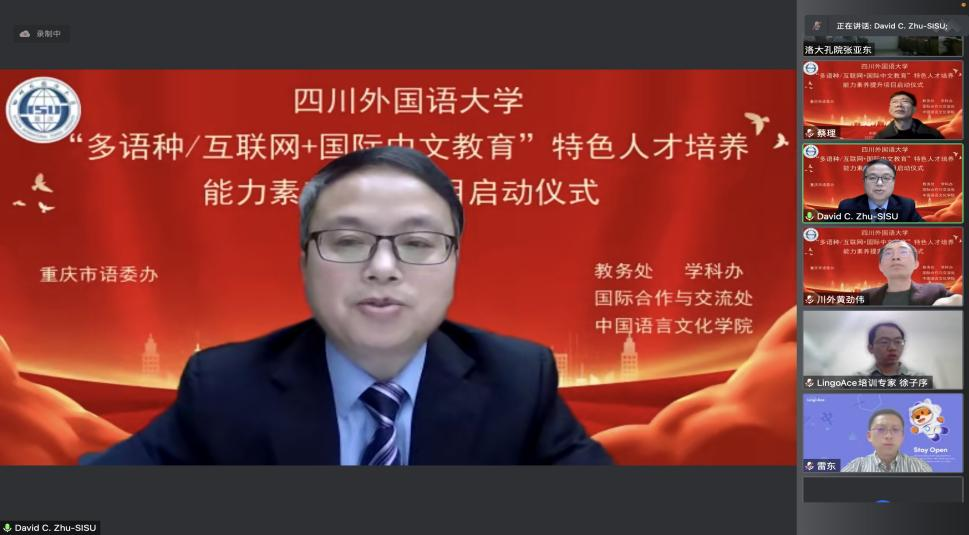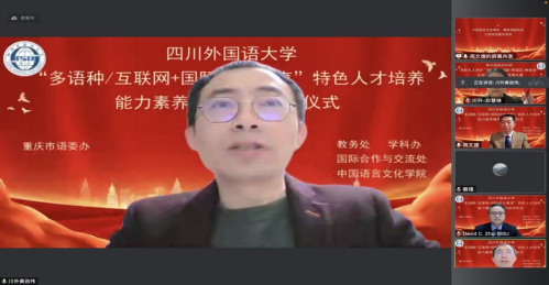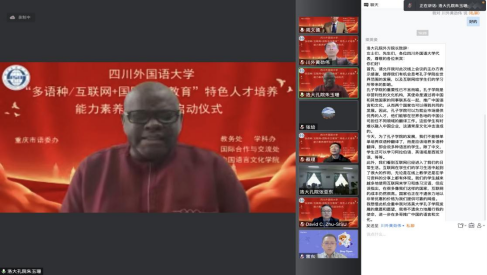 会议最后,祝朝伟副校长进行了总结发言,充分肯定了项目班的积极作用。首先他欢迎各位专家学者通过云端莅临此次开班仪式,他还强调四川外国语大学是我国西部地区唯一的一所以培养高水平、外向型、复合型、应用型、国际化高级专门人才为特色和优势的高校。开设外语专业24个,涉及22个外语语种。建校70年来,学校始终肩负国家使命、服务地方发展,立足西部、放眼全球,秉承“海纳百川、学贯中外”的大学精神,培养了20多万名各类专门人才,为祖国西南特别是川渝经济发展和涉外事务作出了重要贡献,为 “一带一路”国家和地区经济社会发展贡献智慧和力量。2021年,我校获批重庆市高水平新文科建设高校、重庆市国际化特色高校,两个重大项目的获批既充分肯定了川外的办学成绩,也为川外“十四五”期间新文科建设、整合“多语+”国际化人才培养、国际人文交流合作、国际传播智库能力提升、多语种跨文化服务等项目与平台建设等提出了新的要求。为了落实我校两大重庆市高校建设项目的工作,中国语言文化学院承担的此次项目在重庆市语委办相关领导的大力支持下,举办这次“多语种+国际中文教育”“互联网+国际中文教育”特色人才培养能力素养提升项目班,一定要汲取校内外、国外多哥洛美大学孔子学院等孔子学院和LingoAce等合作机构以及国内外名家和人才资源和成功经验,把这次能力素养提升项目班办好,把人才库建设好。