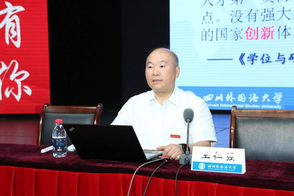 上午9点,随着中华人民共和国国歌《义勇军进行曲》的响起,活动缓缓拉开帷幕,随后,王仁强副校长作题为“科学道德与学风建设”的主旨报告,他从研究生的学习特点、为什么要科研创新、什么是科研创新、如何进行科研创新这四个方面展开,并向同学们简单介绍了自己的科研创新成果。王仁强副校长将科学研究比作接力赛跑,强调要站在巨人的肩膀上进行学术创新,充分学习前人的研究成果。最后,王仁强副校长对2023级的研究生们寄予了美好祝愿,希望同学们学有所成,充分发挥自己的潜力,在川外度过精彩的时光。