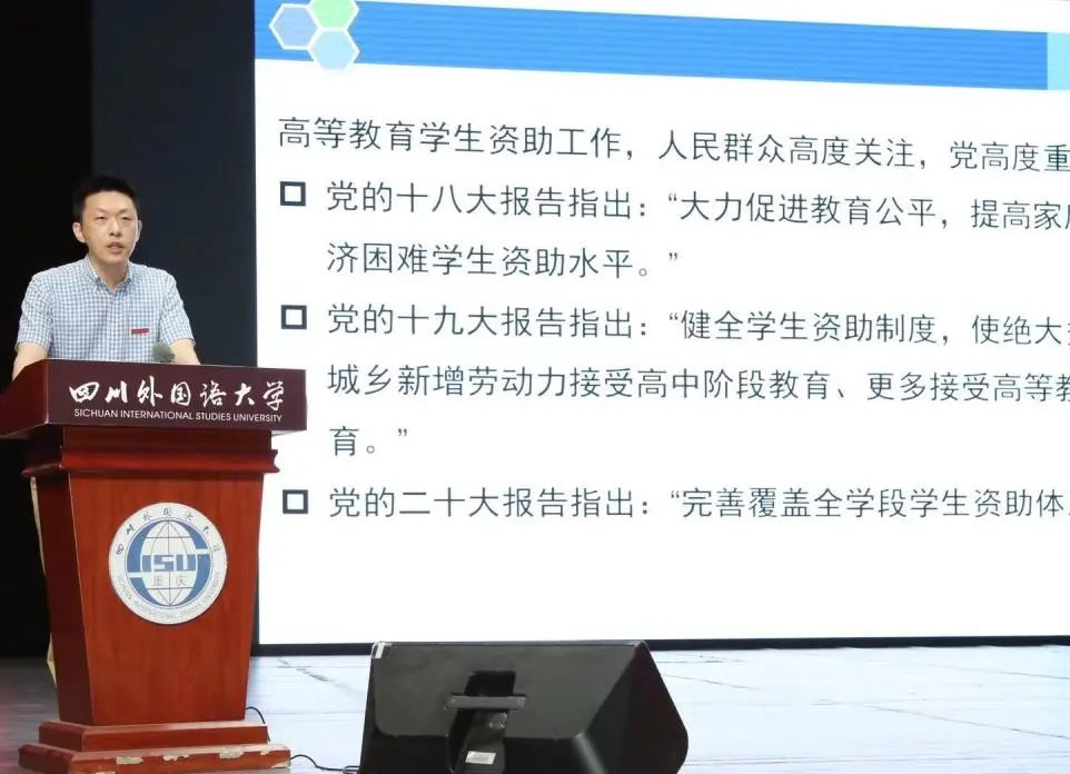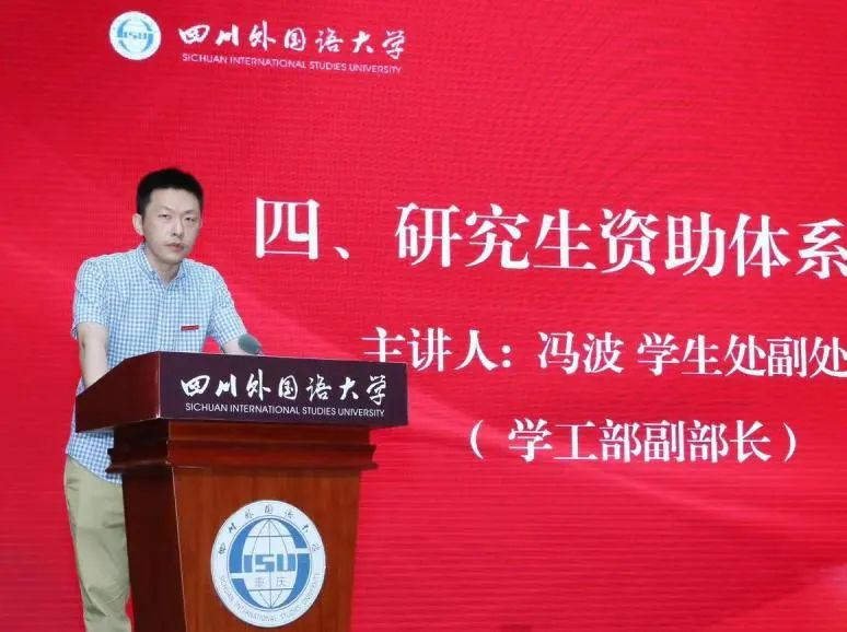 随后,学生处副处长、学工部副部长冯波老师为同学们介绍了研究生资助体系,他指出了研究生资助体系的全面性与多样性,并对四川外国语大学研究生助学金管理办法作了详细介绍。