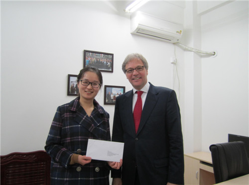 2014年11月5日,德国杜塞尔多夫市副市长兼文化局局长汉斯-格奥尔格·洛尔(hans-georg lohe)先生专程访问我校,为德语系蔡焰琼老师颁发首届海因里希·海涅奖学金证书。海因里希·海涅奖学金是杜塞尔多夫市原市长艾博思先生2013年访问川外期间提议设立的。根据他的提议,杜塞尔多夫市决定,从2015年起,为其伙伴城市(重庆/中国、莫斯科/俄罗斯、华沙/波兰、雷丁/英国、海法/以色列)和友好城市(图卢兹/法国、千叶县/日本)中从事语言学以及德语现当代文学研究的年轻学者提供为期五个月的奖学金,进一步促进双方的文化交流。该奖学金将每年轮流颁发给不同的友好城市,鉴于我校与杜塞尔多夫大学以及杜塞尔多夫海涅研究所的密切合作关系和突出合作成效,我校教师蔡焰琼成为第一个获得该奖学金的年轻学者。