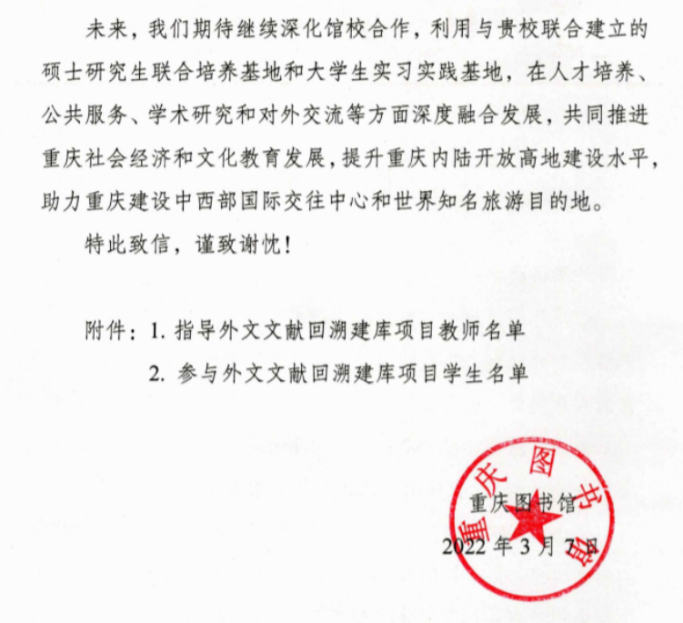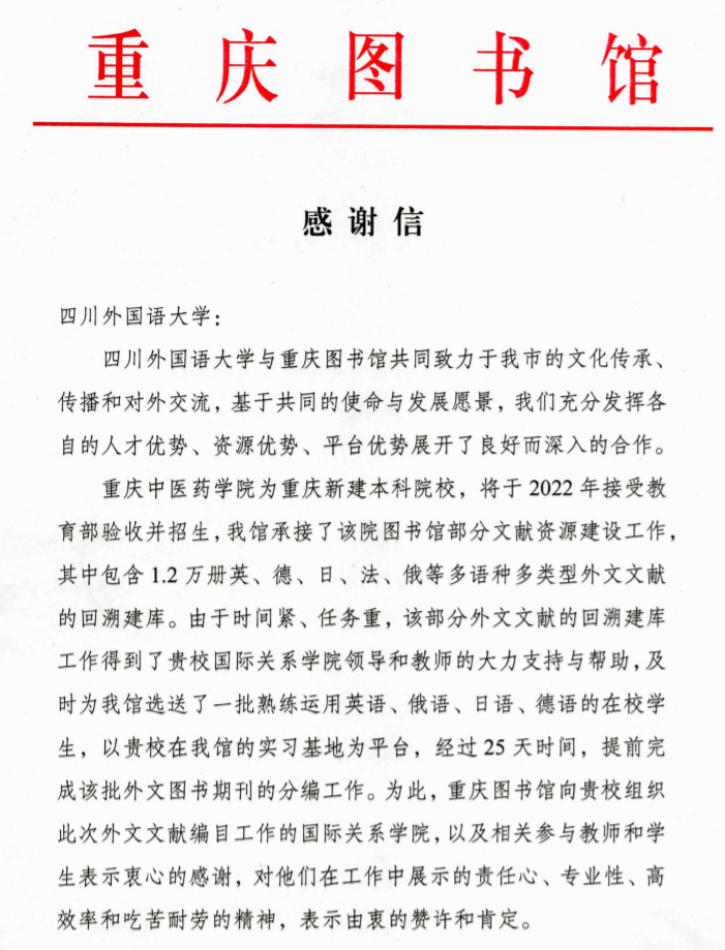 我校近日收到重庆图书馆发来的感谢信,感谢我校国际关系学院对于重庆图书馆文献资源建设工作的大力支持,感谢来自四川外国语大学各个学院共计37位同学在寒假休息期间长达25天时间认真细致的实习工作,协助重庆图书馆高质量、高效率完成对重庆中医药学院图书馆1.2万册英、德、日、俄、法等多语种外文文献的回溯建库工作。