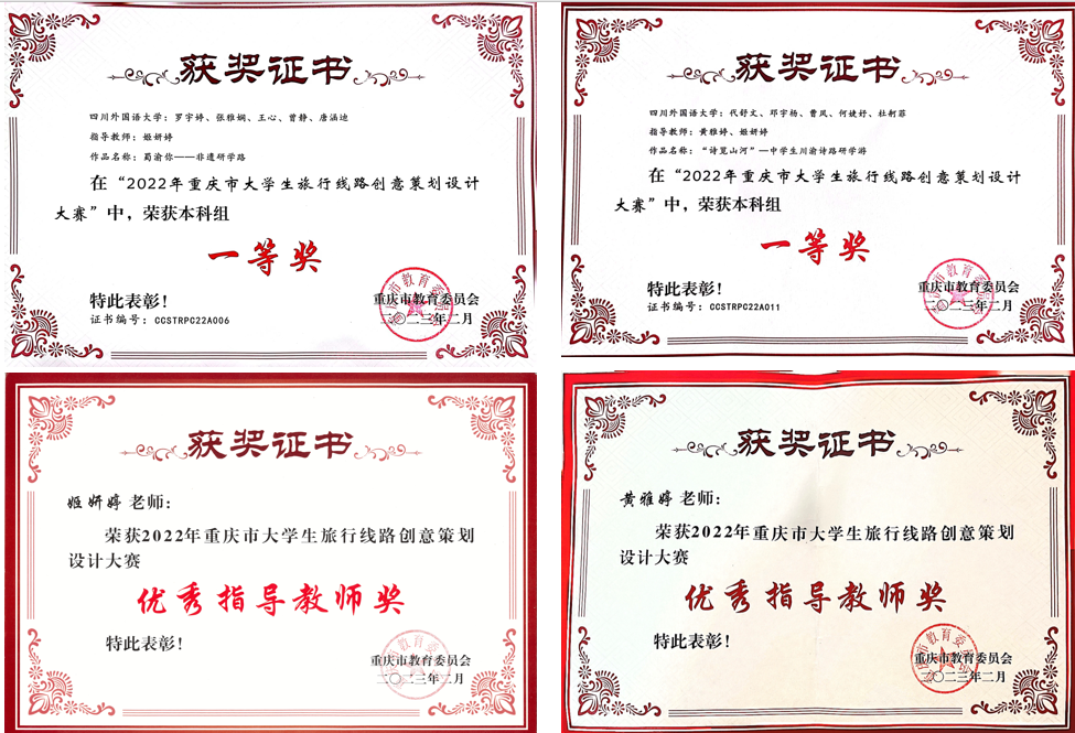 近日,由重庆市教育委员会主办的重庆市大学生旅行线路创意策划设计大赛圆满落下帷幕。历经校赛评选、市级资格赛和市级总决赛的激烈角逐,我校国际工商管理学院遴选参评的《诗览山河-川渝叶正红》《巴渝瑰宝,游历十年》两个项目均荣获市级一等奖,姬妍婷和黄雅婷老师也分别荣获优秀指导教师奖。