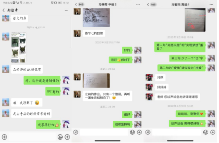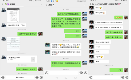 承担口语课程的陆丹妮老师的解决方法是,在教学平台上录制课程讲解知识点,同时建立课程微信群,以语音的方式完成互动及作业。虽然过程较为繁琐,但陆老师还是细致地纠正每一个不正确的发音,教学效果令人满意。目前,几乎每位老师都建立了课程微信群,在与学生互动的同时,也可实时对留学生们的提问进行答疑。