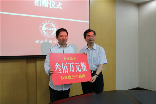 “衔环结草,以报恩德”,彭建虎对母校一直怀抱着深厚的情怀。2010年母校六十华诞时,他向学校捐赠100万元,设立川外“建虎奖学金”;今年6月他再次回到母校,捐资300万作为教育发展基金,支持母校“语言加专业、理论加实践”的学科建设和人才培养,并继续捐资50万元购买为学校优质精品课程。他还决定为母校捐建一座游泳池……