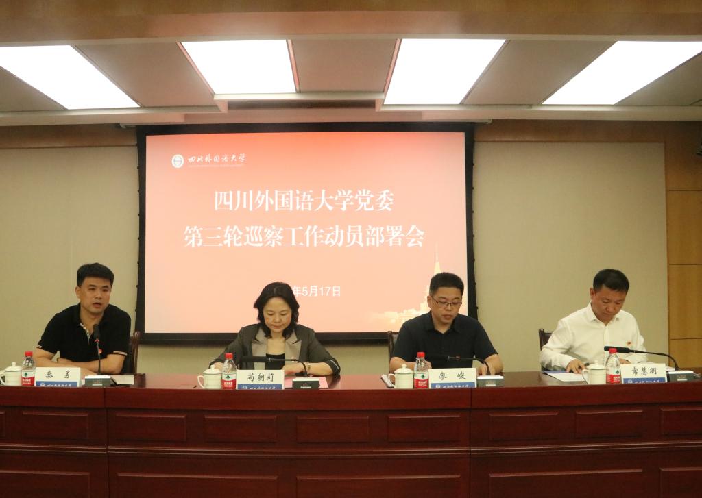5月17日下午,学校党委第三轮巡察工作动员会召开。学校党委将于5月16日—6月16日对商务英语学院党总支开展巡察。党委副书记、党委巡察工作领导小组副组长苟朝莉,第三轮巡察组组长廖峻及成员,商务英语学院全体领导班子及师生代表参加会议。会议由学校党政办公室(党委巡察办公室)主任秦勇主持。