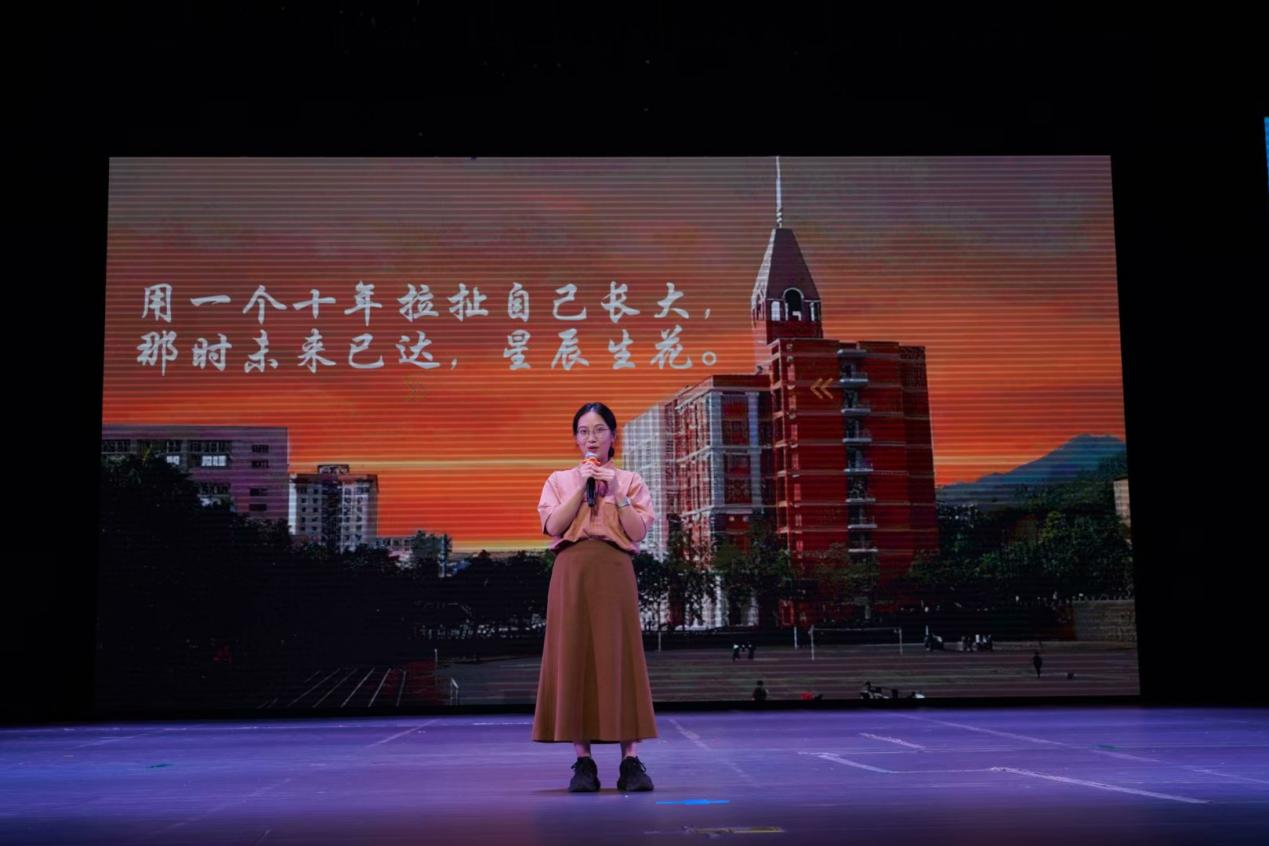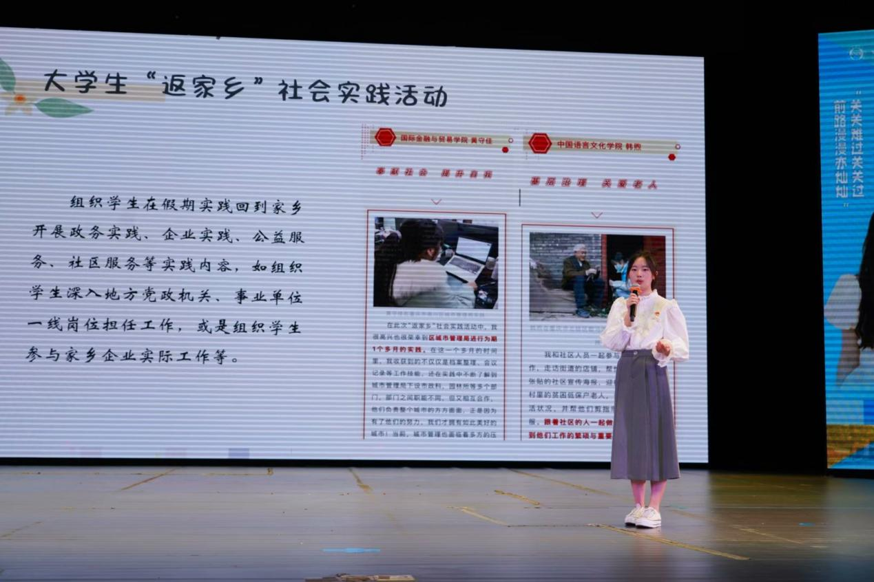重庆市2023年优秀学生干部获得者王诗瑜同学带来《实践路上,成长花开》为题的演讲,王诗瑜同学特别提到自己在研究生支教团的支教的经历和收获,她用“用一年不长的时间,做一件终身难忘的事。”来总结自己在研支团难忘的志愿经历。