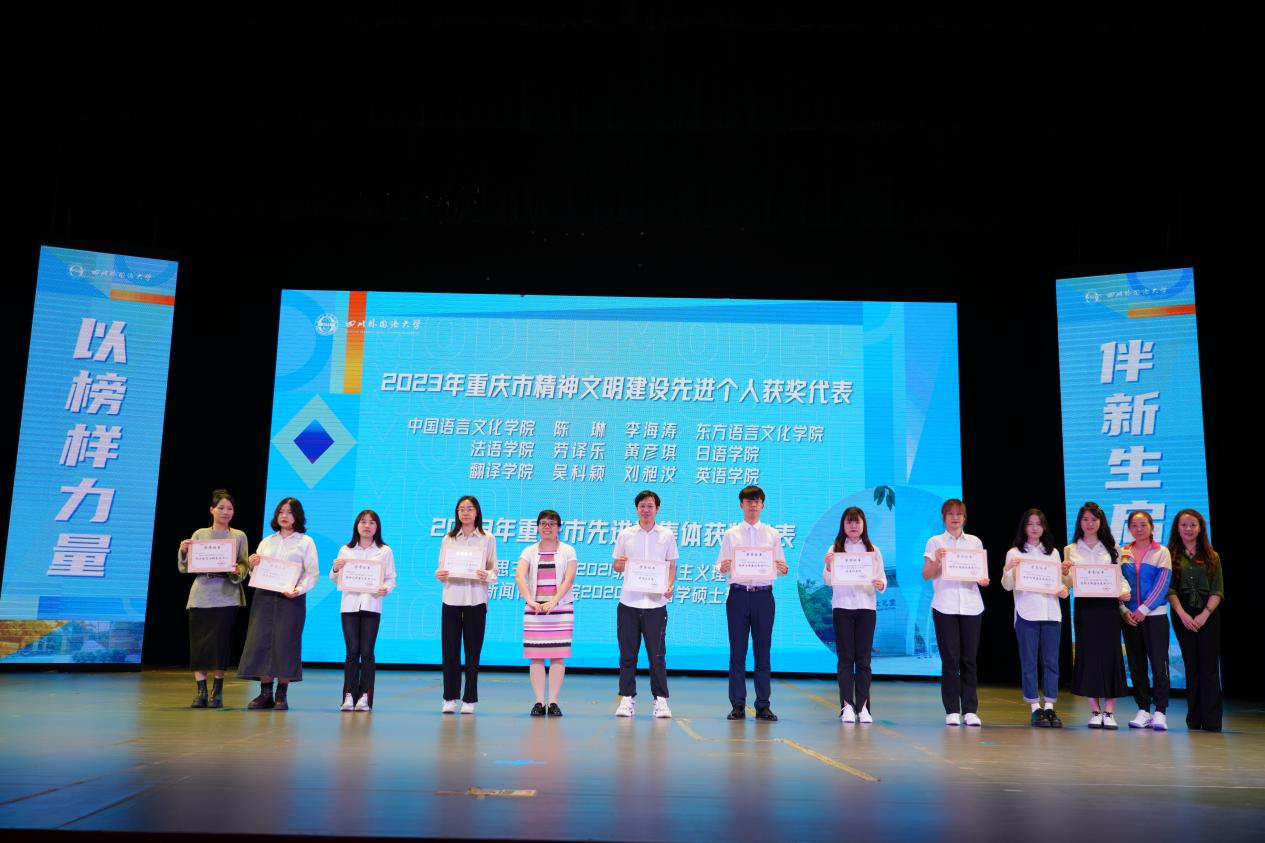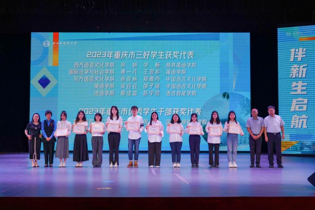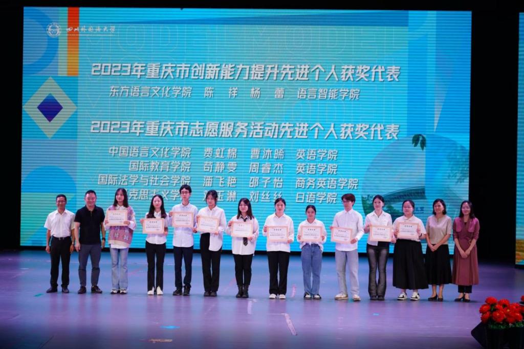 会上,党委学生工作部部长、学生处处长崔光军宣读了2022-2023学年我校获得国家奖学金、国家励志奖学金、重庆市先进个人和集体的表彰名单,与会领导及嘉宾为受表彰的集体和个人颁奖。2022-2023学年我校64名同学获得国家奖学金,401名同学获得国家励志奖学金;25名同学获得重庆市普通高校2023学年度三好学生,16名同学重庆市普通高校2023学年度优秀学生干部,18名同学获得重庆市普通高校2023学年度精神文明建设先进个人,18名同学获得重庆市普通高校2023学年度志愿服务活动先进个人,13名同学获得重庆市普通高校2023学年度创新能力提升先进个人,8名同学重庆市普通高校2023学年度体育活动先进个人,4名同学重庆市普通高校2023学年度艺术教育活动先进个人,4个班集体获得重庆市普通高校2023学年度先进班集体。