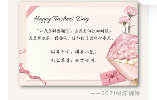 新闻传播学院学生会发起了“感谢师恩”教师节庆祝活动,学生们将精心准备的贺卡和鲜花献给敬爱的老师们。