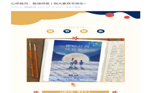 翻译学院在线上和线下同时开展“心怀皓月,敬颂师恩”的庆祝活动。在线上,翻译学院在公众号上发表了系列推文,表达对全院教师的节日问候和祝福!在线下,学院工会发起“全民打卡健身,提升身体素质”倡议,号召教师在工作之余,注意锻炼身体,保障身体健康。