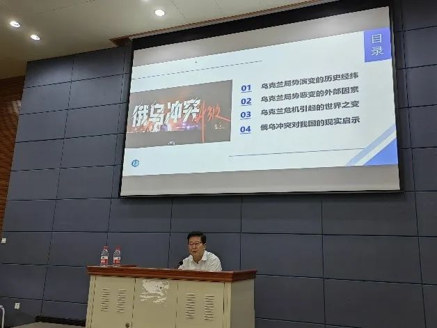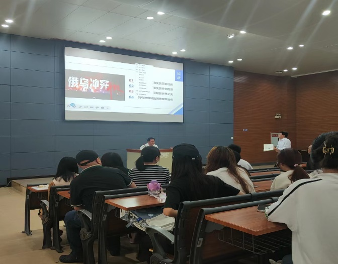 王铭玉教授从乌克兰局势演变的历史经纬、外部因素、俄乌冲突引起的世界之变以及俄乌冲突对我国的现实启示这四个方面展开讲解。王教授认为,俄乌冲突引发了世界局势的巨大变化,一方面,全球地缘政治格局发生新变化,美俄之间的结构性矛盾更加凸显,长期敌对关系更难扭转,欧盟对俄各个领域施加严厉制裁,俄欧各领域“脱钩”明显,深层次利益冲突和矛盾愈演愈烈;另一方面,世界经济面临新困境,俄乌冲突使全球能源市场、粮食供给、全球产业链工业链以及国际金融秩序受到强烈冲击。王教授指出,我国在俄乌冲突问题上始终站在和平一边,始终秉持客观公正的态度,坚持各国主权、领土完整,遵守联合国宪章宗旨和原则,尊重各国在安全问题上的合理关切,一切有利于和平解决危机的努力都应该得到支持。面对百年未有之大变局,我们应当充分认识当今世界的负面法则,努力再塑当今中国的民族之威,牢牢构筑当今大国的安全防线,勇于面对当今全球的战争威胁。