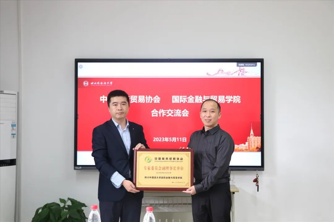 座谈结束后,进行了中国服务贸易协会专家委员会副理事长单位授牌仪式,王小伟秘书长助理对国际金融与贸易学院加入中国服务贸易协会专家委员会表示欢迎,也希望以此次座谈会为契机,未来与川外能有更多的合作与交流。