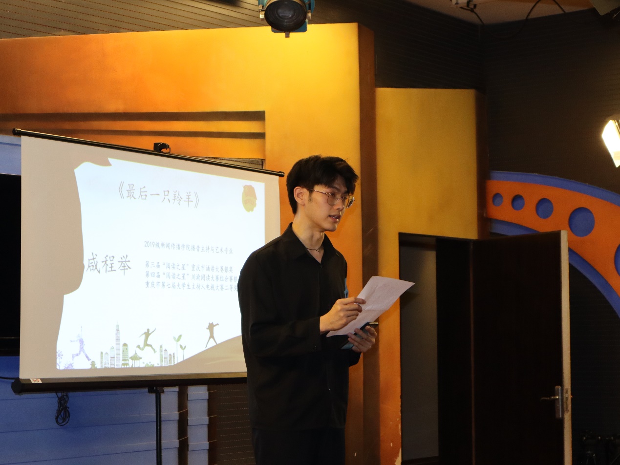 比赛正式开始前,咸程举同学为观众朗诵了《最后一只藏羚羊》。他的声音铿锵有力,感情循序渐进,时而兴奋、激动,时而悲愤、激昂,把藏羚羊的遭遇与心理活动演绎的淋漓尽致,通过语言的渲染,使听众如见其形、如闻其身、如临其境。在他的带动下,同学们的参赛激情被进一步激发。