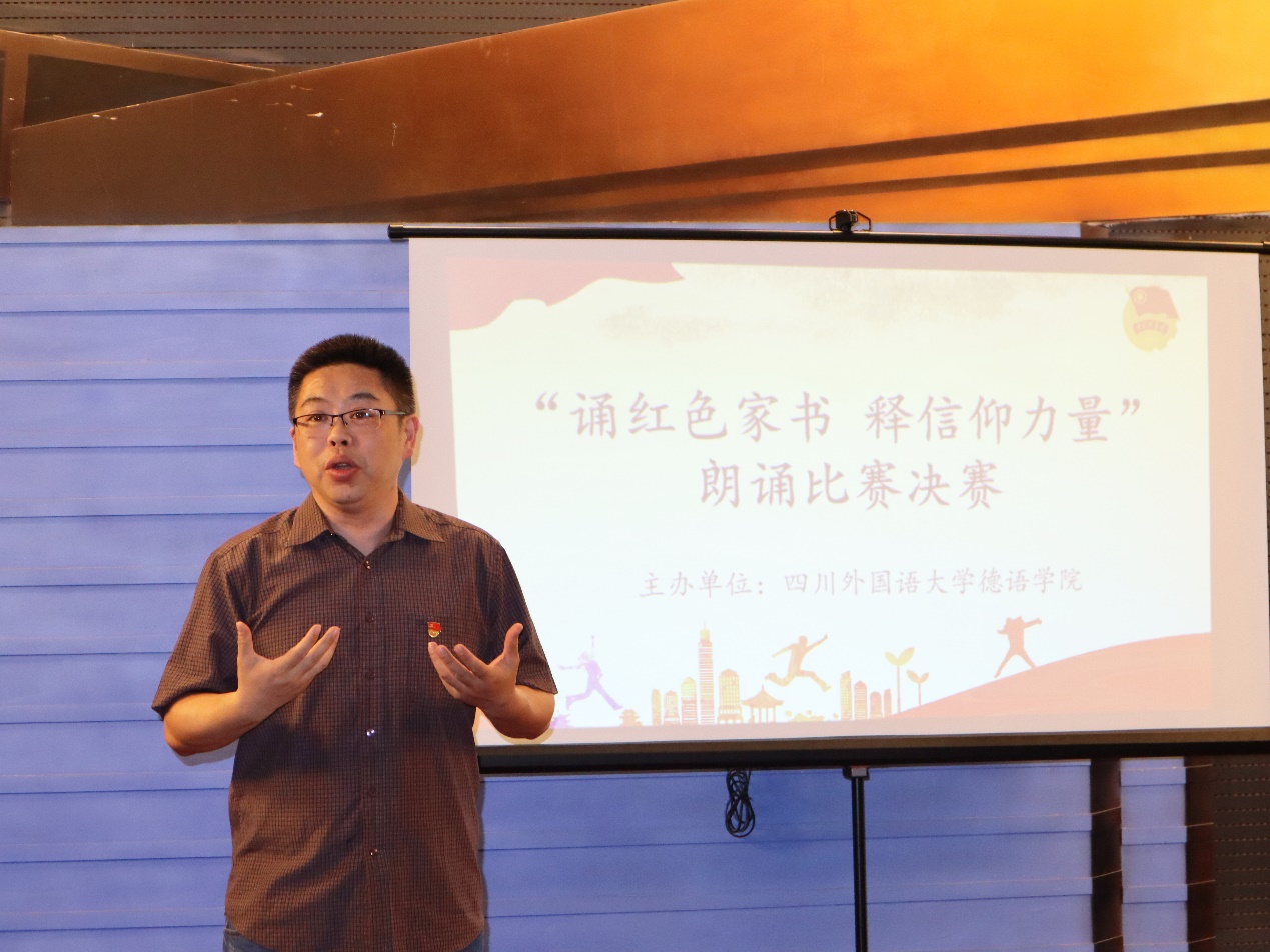 为迎接党的二十大胜利召开、庆祝建团100周年,激昂青春奋斗,铭记革命先烈,走进他们的故事,德语学院围绕“喜迎二十大、永远跟党走、奋进新征程”主题,2022年5月7日晚19点,德语学院在东区大礼堂3-2开展了“诵红色家书 释信仰力量”朗诵比赛。新闻传播学院播音主持艺术系主任吴樾、播音主持艺术专业2019级同学咸程举,德语学院党总支书记廖峻、党总支副书记曾静、团总支书记唐英和德语学院部分同学参加本次活动。