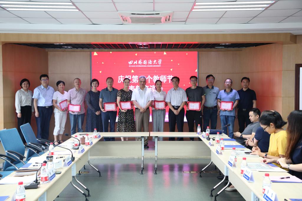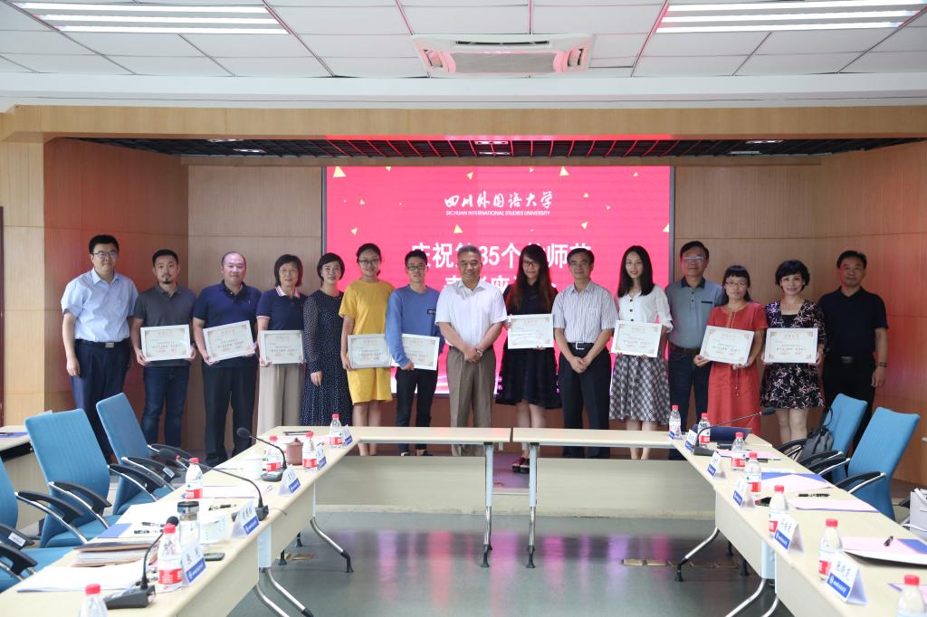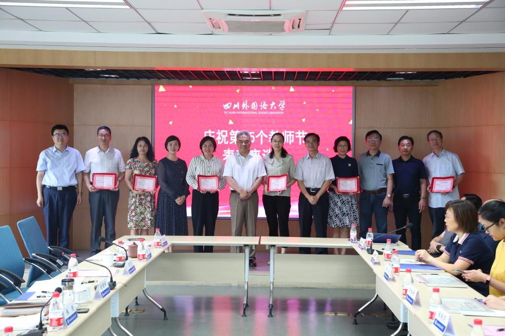 党委副书记张艳宣读《中共四川外国语大学委员会、四川外国语大学关于表彰2019年教书育人楷模的决定》和《四川外国语大学关于颁发三十年教龄教师、学校工作三十年职工荣誉证书的决定》。丁钟等10人获得学校首届教书育人楷模荣誉称号;郑白玲等18人获得三十年教龄、何开全等10人获得学校工作三十年职工荣誉称号。校领导为受表彰教职工颁发荣誉证书并合影留念。