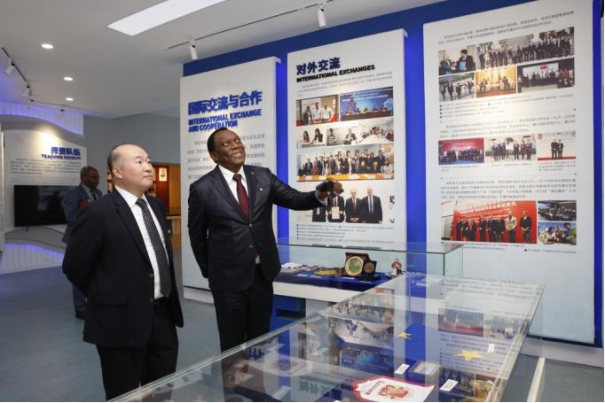 首先,谢胜文大使一行在副校长王仁强的陪同下参观了校史馆,对学校70多年来在人才培养、科学研究、社会服务、文化传承以及国际合作与交流方面取得的成绩表示赞许。